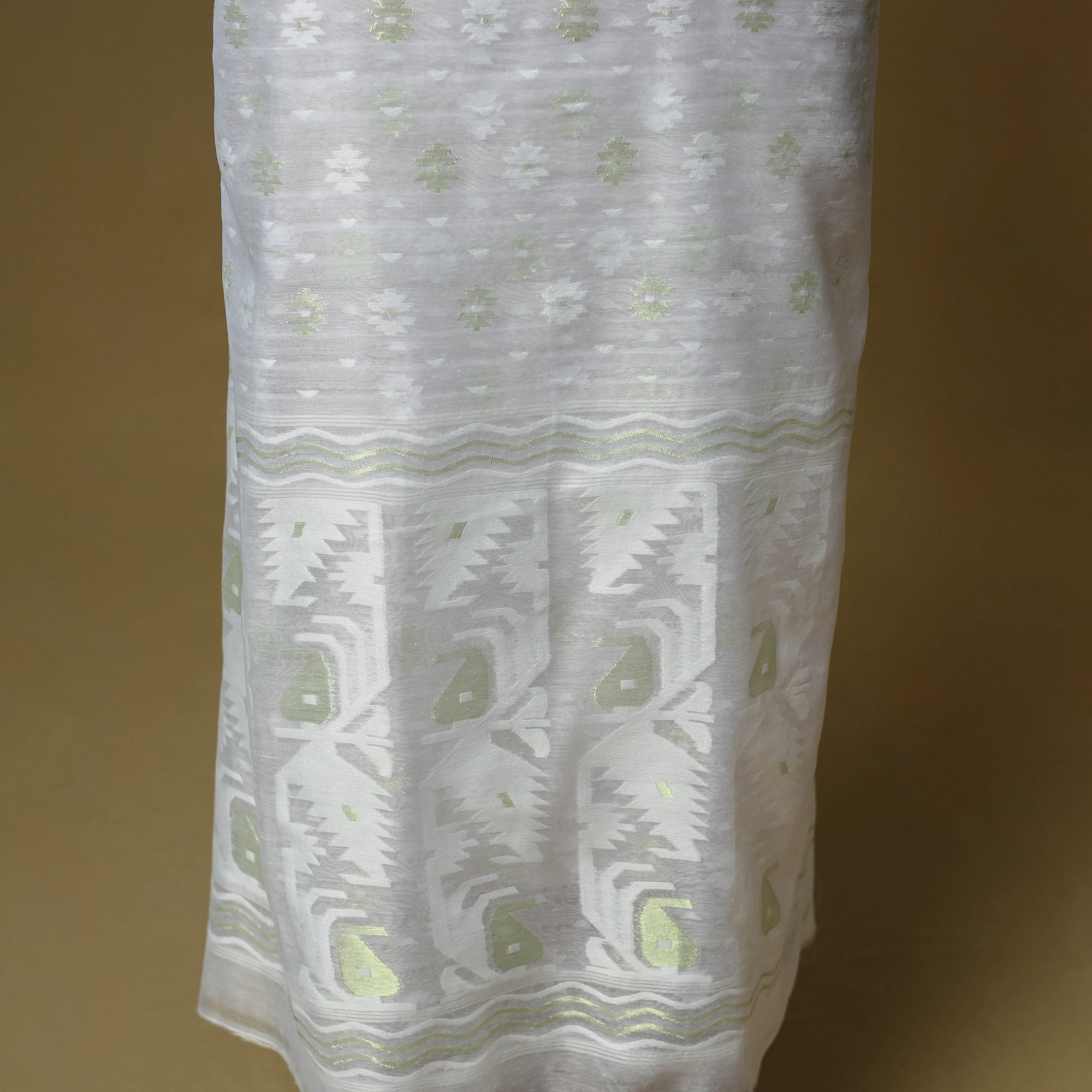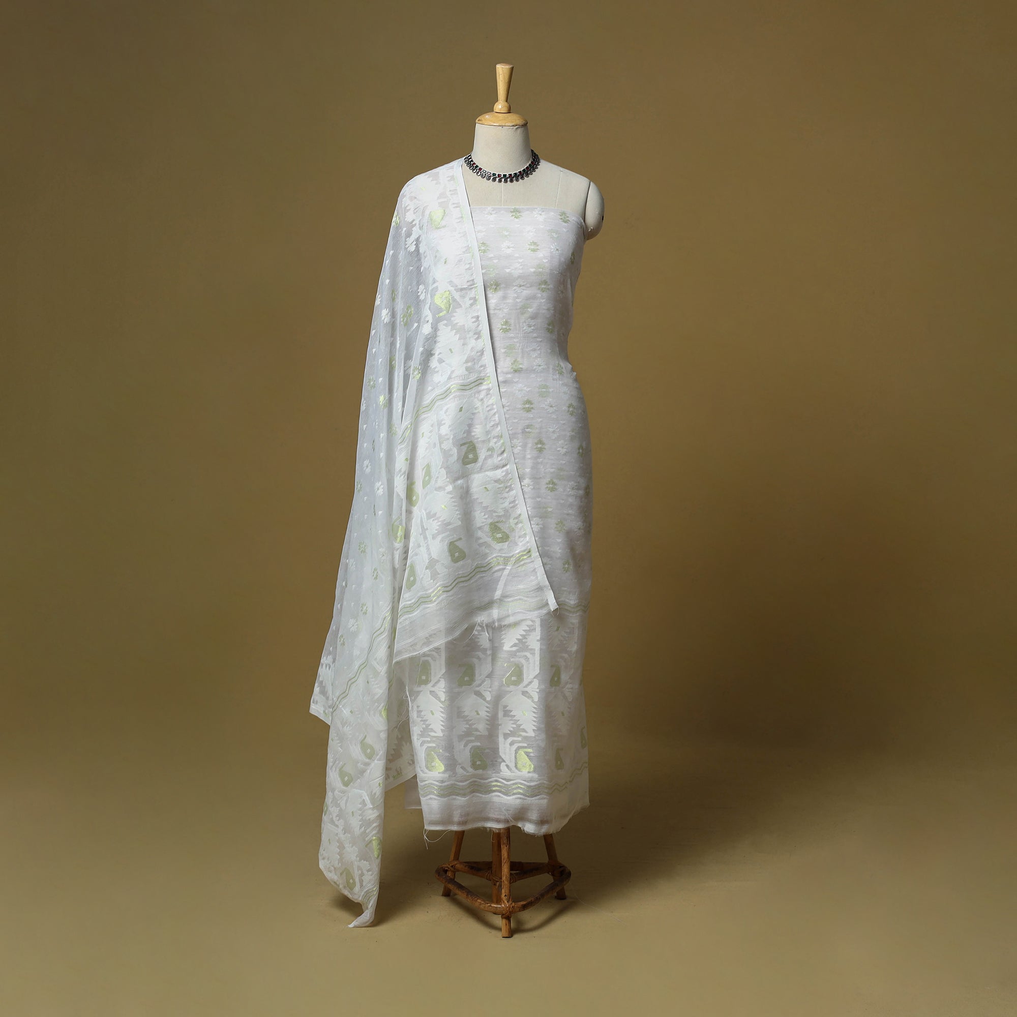 Handloom phulia jamdani silk cotton 2pc unstitched dress material. Crafted using Bengal’s intricate extra-weft weaving technique which creates patterns resembling embroidery on the loom, each motif is delicately woven with small shuttles. Jamdani is among the most time-intensive and treasured handwoven traditions. This set includes a finely woven kurta fabric with a coordinated dupatta, ready to be tailored into any style for a graceful look.