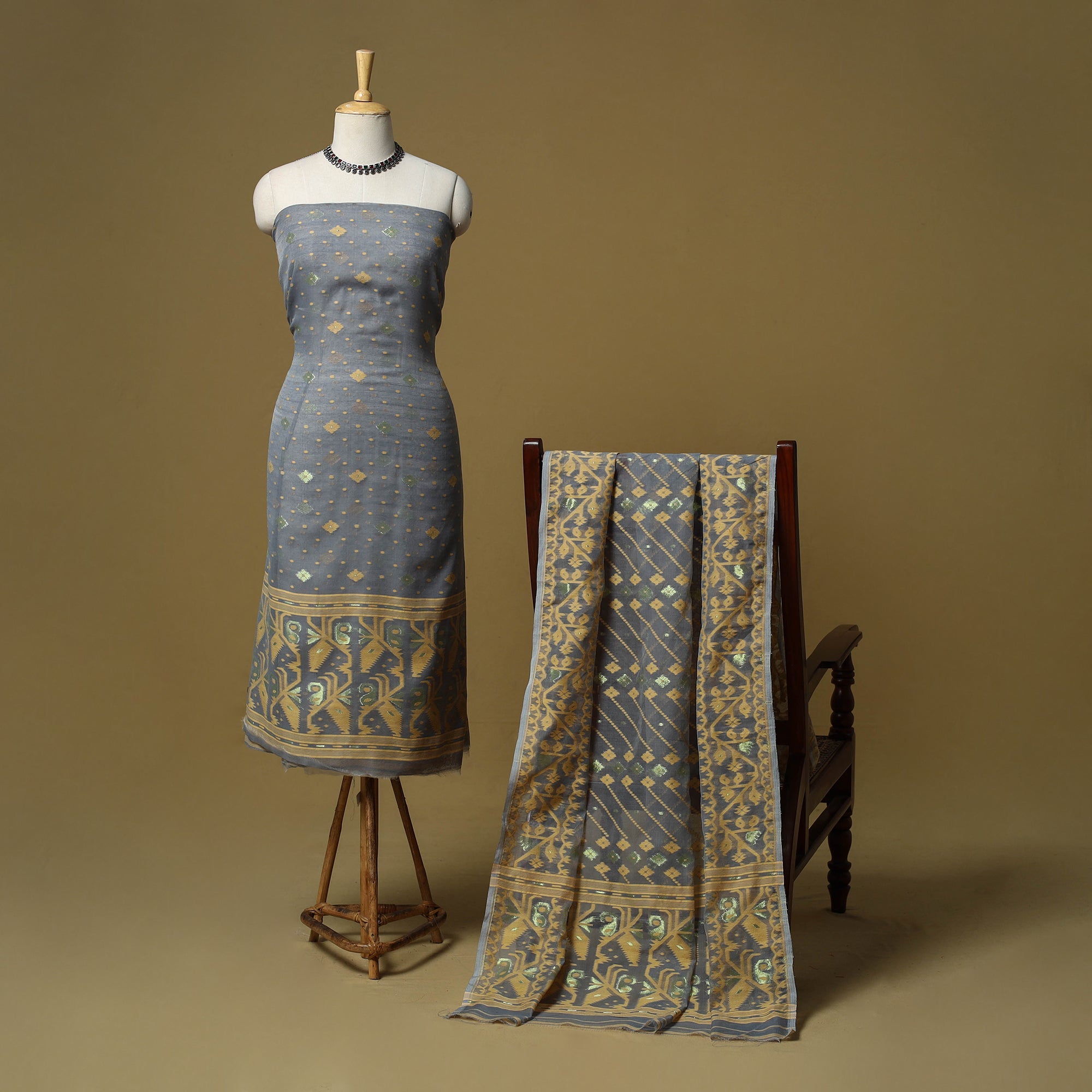 Handloom phulia jamdani silk cotton 2pc unstitched dress material. Crafted using Bengal’s intricate extra-weft weaving technique which creates patterns resembling embroidery on the loom, each motif is delicately woven with small shuttles. Jamdani is among the most time-intensive and treasured handwoven traditions. This set includes a finely woven kurta fabric with a coordinated dupatta, ready to be tailored into any style for a graceful look.