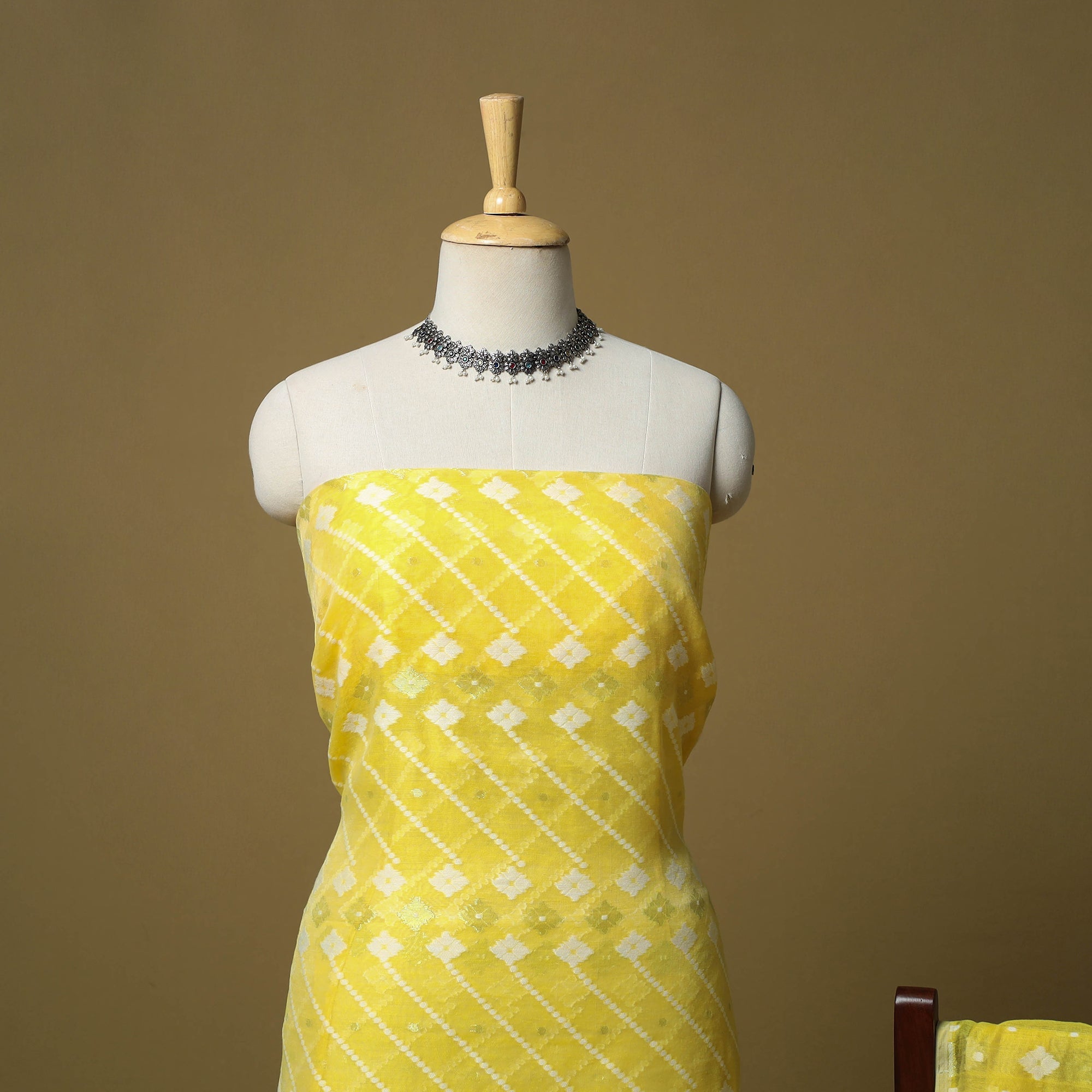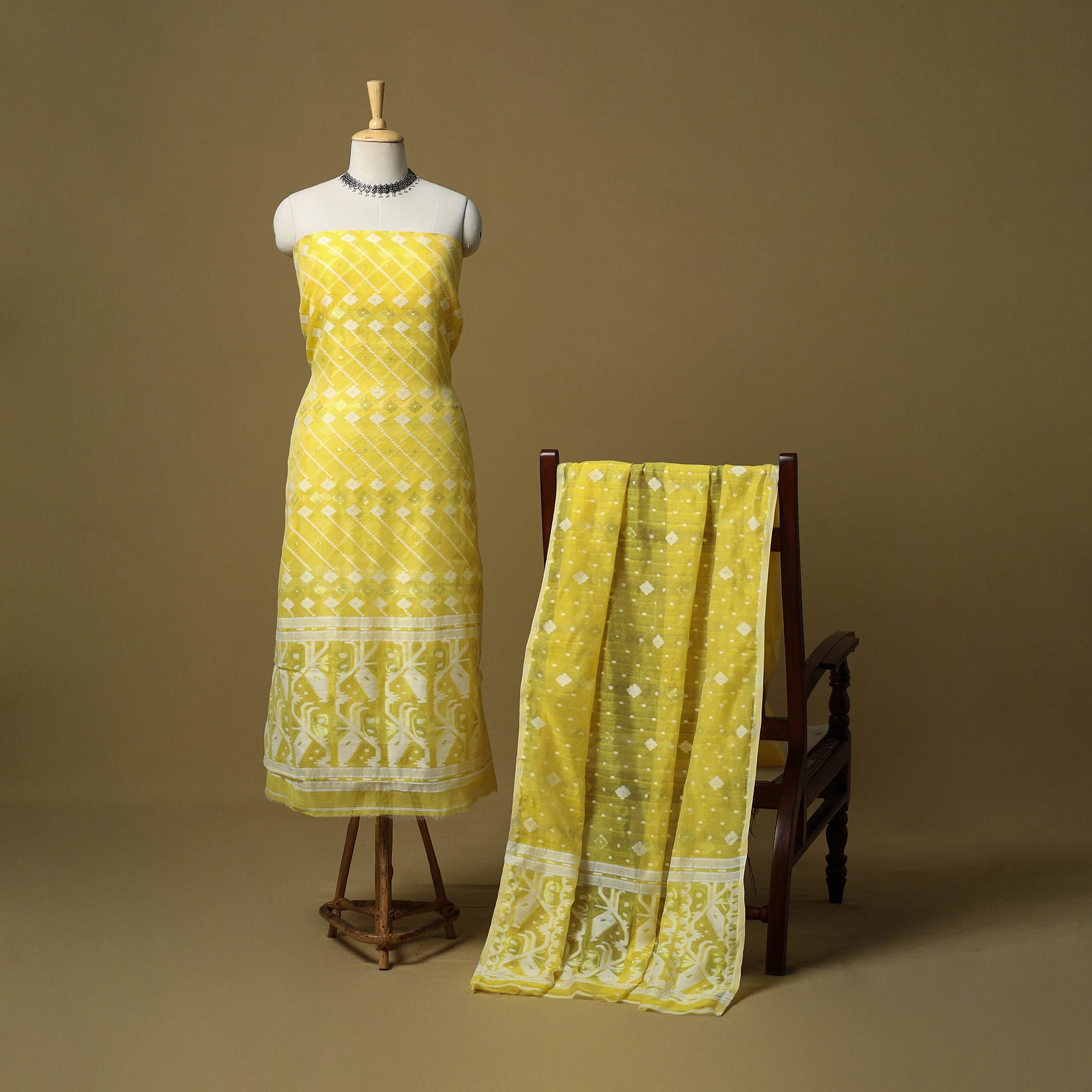 Yellow handloom phulia jamdani silk-cotton 2pc unstitched dress material. Crafted using Bengal’s intricate extra-weft weaving technique which creates patterns resembling embroidery on the loom, each motif is delicately woven with small shuttles. Celebrated for its heritage and artistry, Jamdani is among the most time-intensive and treasured handwoven traditions. This set includes a finely woven kurta fabric with a coordinated dupatta, ready to be tailored into any style for a graceful look.