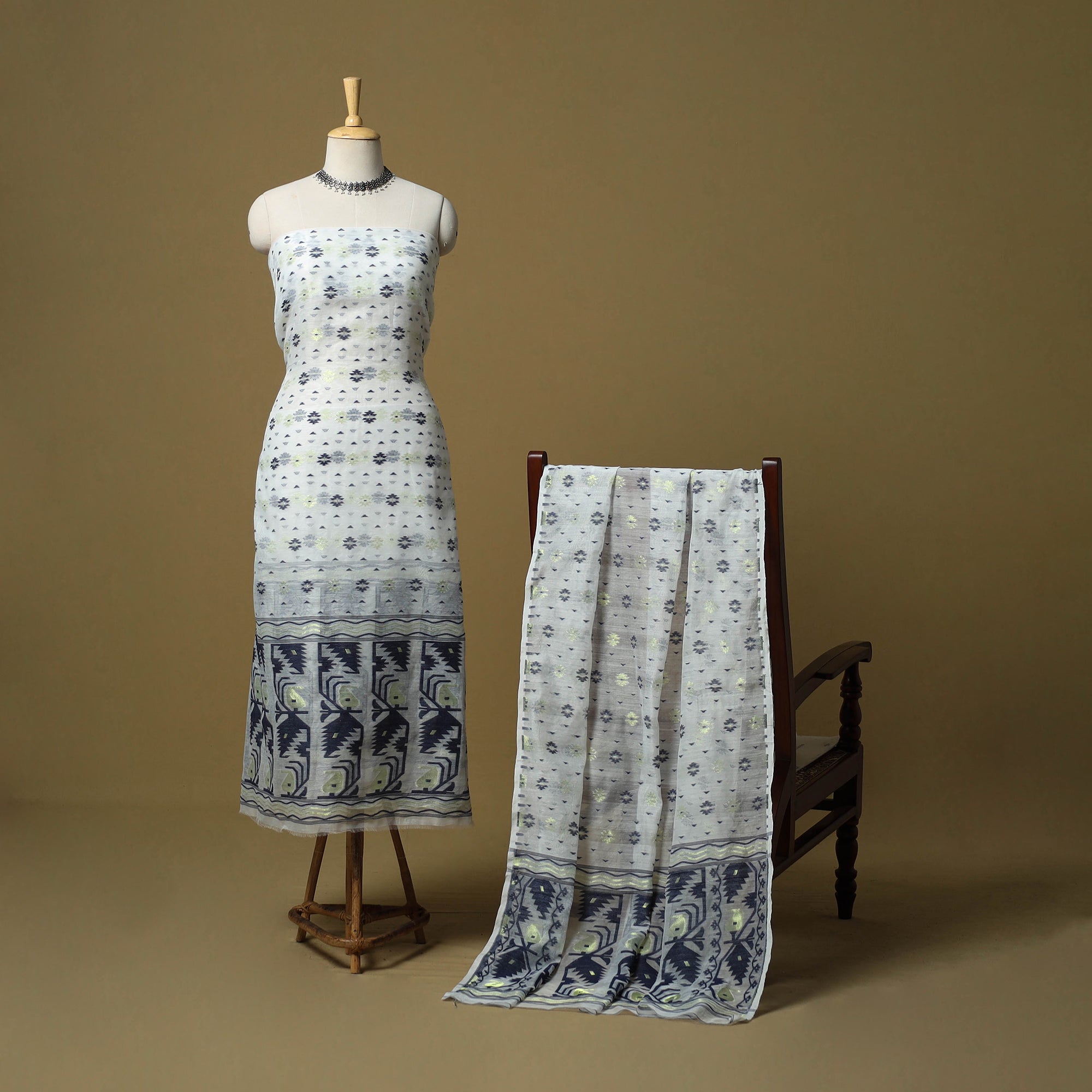 Handloom phulia jamdani silk-cotton 2pc unstitched dress material. Crafted using Bengal’s intricate extra-weft weaving technique which creates patterns resembling embroidery on the loom, each motif is delicately woven with small shuttles. Celebrated for its heritage and artistry, Jamdani is among the most time-intensive and treasured handwoven traditions. This set includes a finely woven kurta fabric with a coordinated dupatta, ready to be tailored into any style for a graceful look.