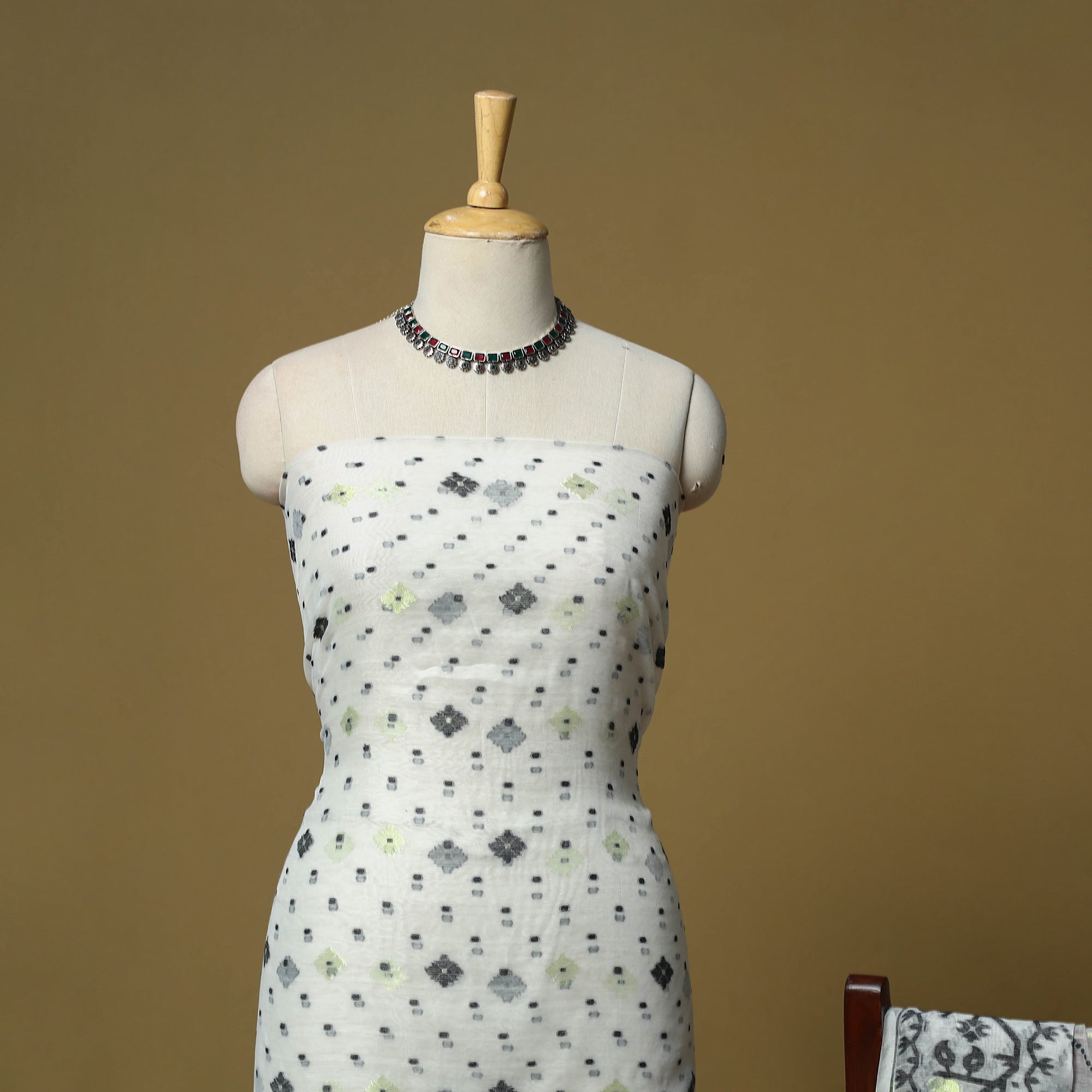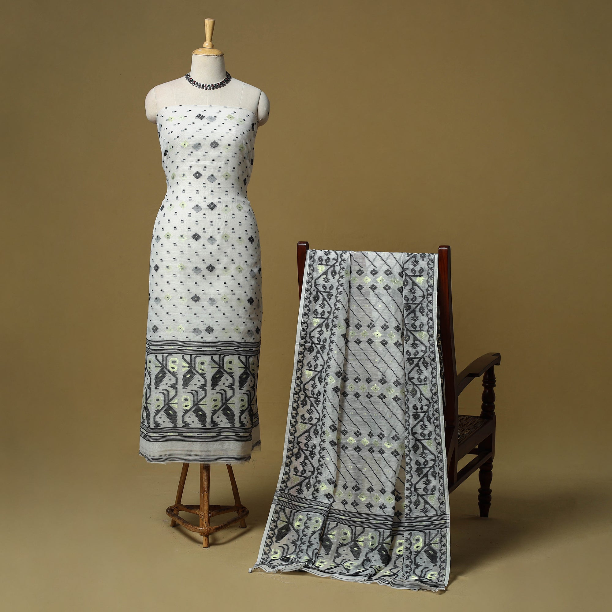 Handloom phulia jamdani silk cotton 2pc unstitched dress material. Crafted using Bengal’s intricate extra-weft weaving technique which creates patterns resembling embroidery on the loom, each motif is delicately woven with small shuttles. Jamdani is among the most time-intensive and treasured handwoven traditions. This set includes a finely woven kurta fabric with a coordinated dupatta, ready to be tailored into any style for a graceful look.