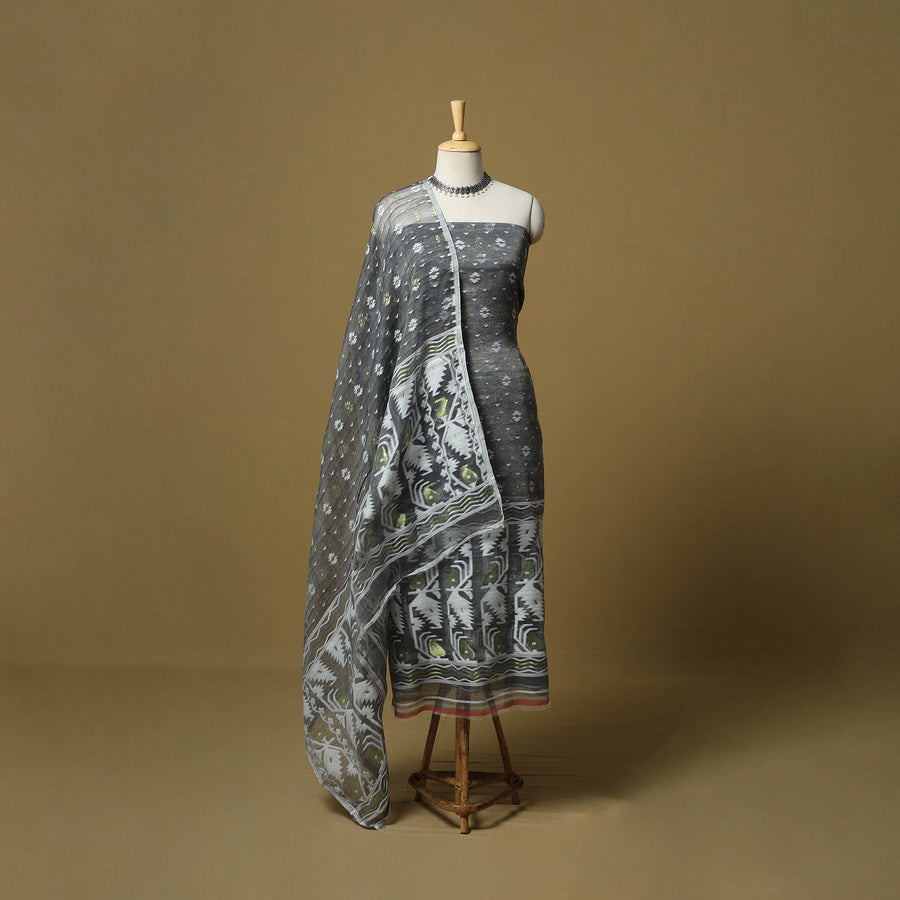 Grey handloom phulia jamdani silk-cotton 2pc unstitched dress material. Crafted using Bengal’s intricate extra-weft weaving technique which creates patterns resembling embroidery on the loom, each motif is delicately woven with small shuttles. Celebrated for its heritage and artistry, Jamdani is among the most time-intensive and treasured handwoven traditions. This set includes a finely woven kurta fabric with a coordinated dupatta, ready to be tailored into any style for a graceful look.