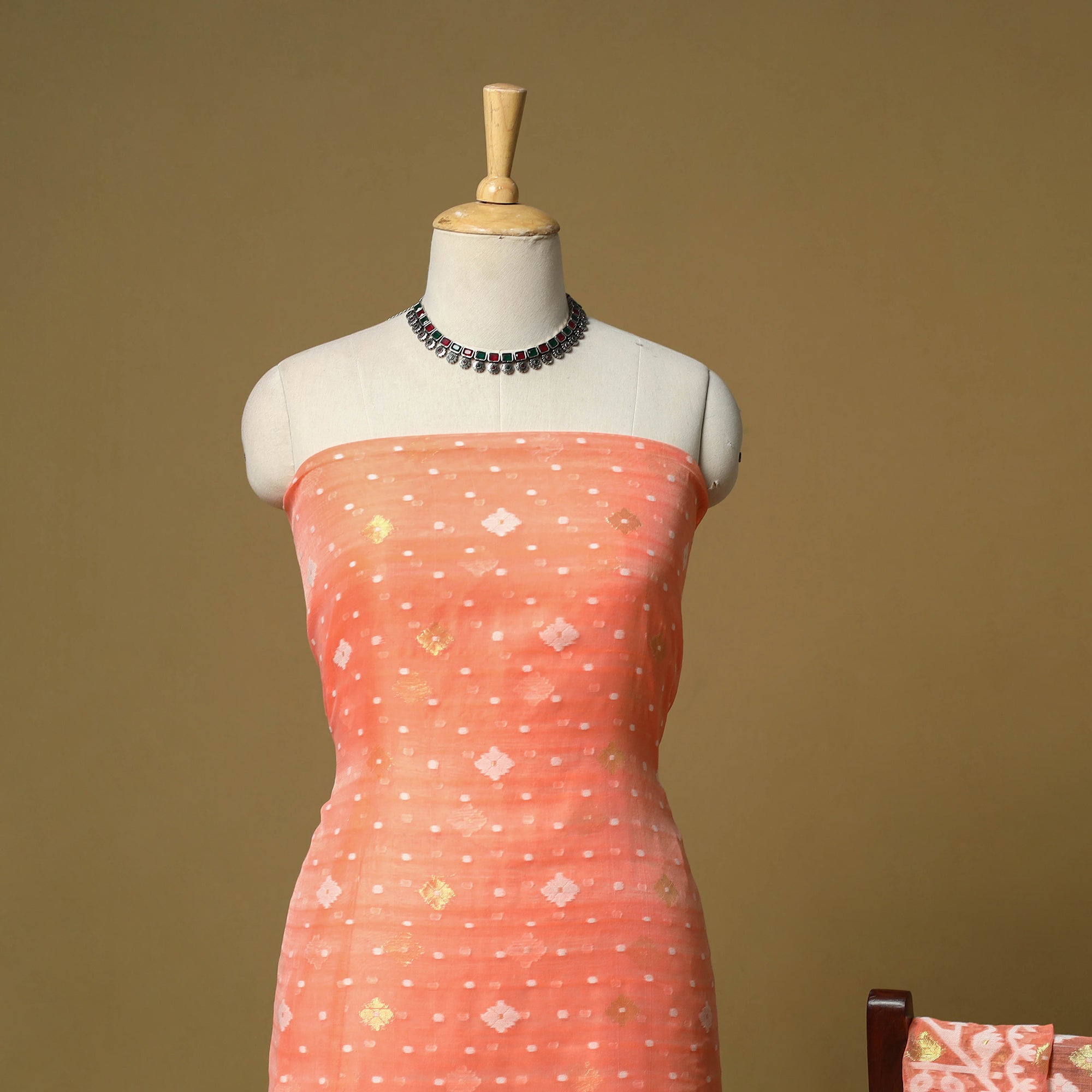Handloom phulia jamdani silk cotton 2pc unstitched dress material. Crafted using Bengal’s intricate extra-weft weaving technique which creates patterns resembling embroidery on the loom, each motif is delicately woven with small shuttles. Jamdani is among the most time-intensive and treasured handwoven traditions. This set includes a finely woven kurta fabric with a coordinated dupatta, ready to be tailored into any style for a graceful look.