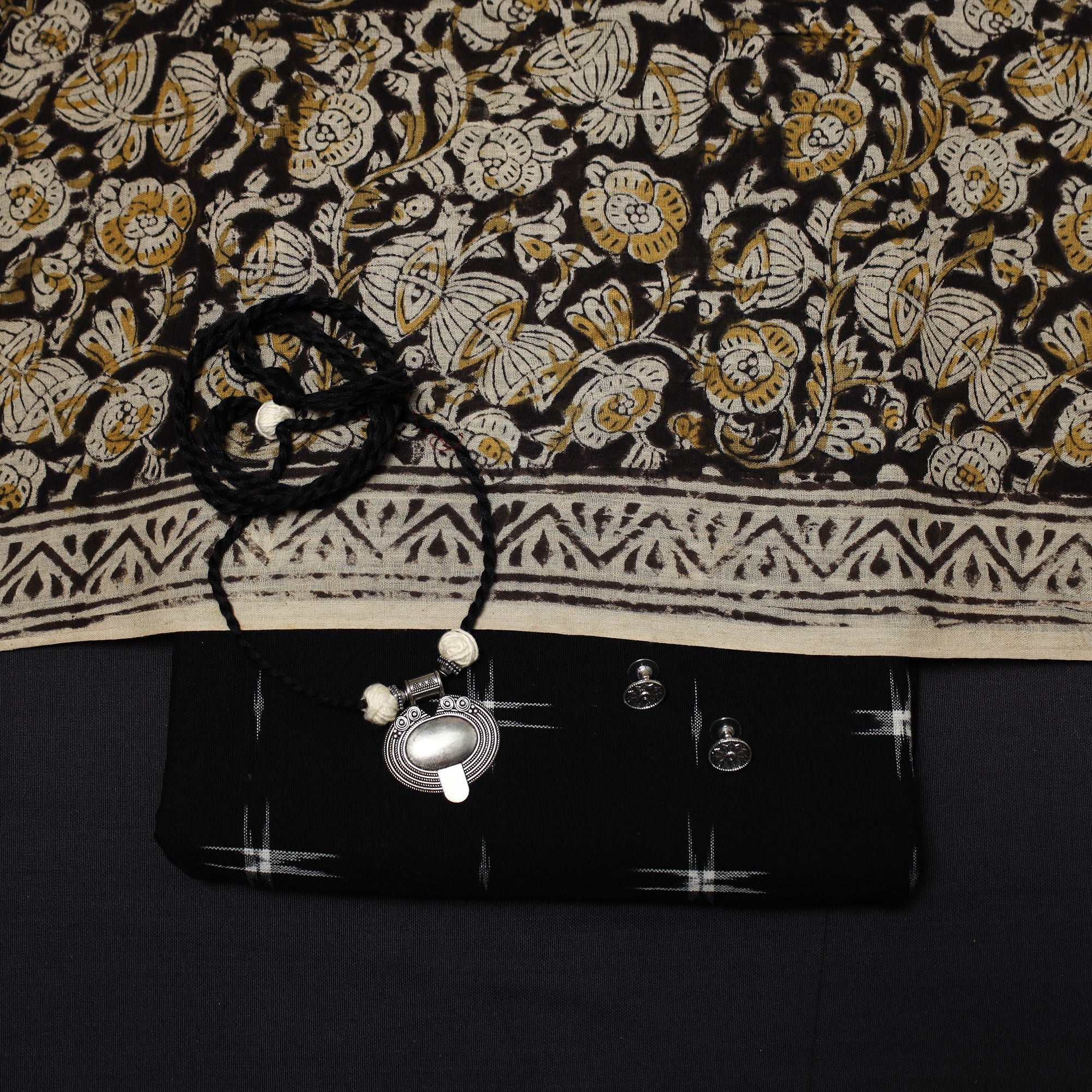 Pure cotton 2pc unstitched dress material set features pochampally ikat handloom kurta fabric where the threads are dyed before weaving to create patterns. It is paired with kalamkari printed dupatta. The set also includes a handcrafted necklace and matching earrings.