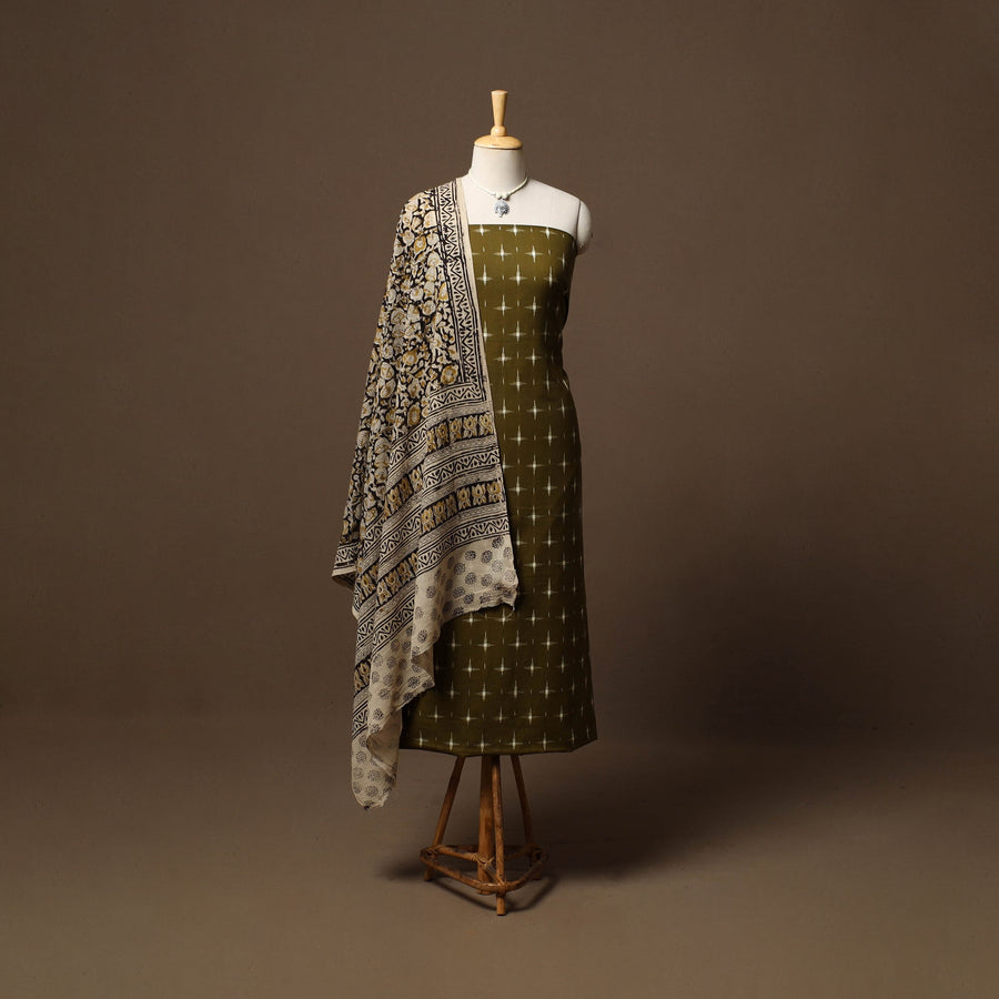 Pure cotton 2pc unstitched dress material set features pochampally ikat handloom kurta fabric where the threads are dyed before weaving to create patterns. It is paired with kalamkari printed dupatta. The set also includes a handcrafted necklace and matching earrings.