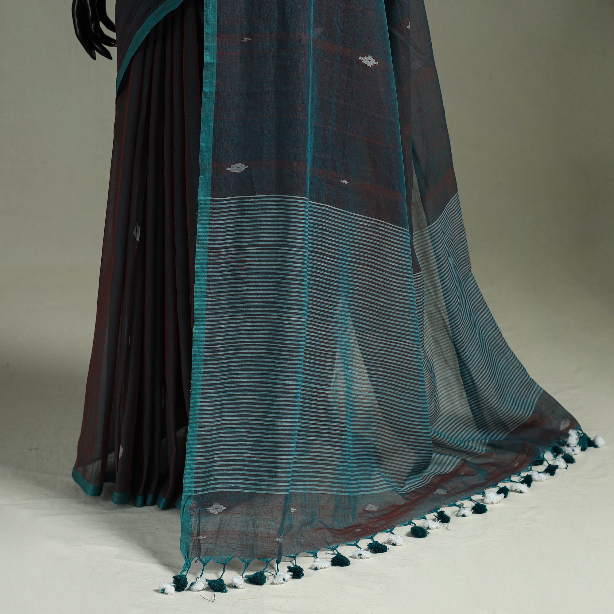 Handwoven jamdani pure mul cotton saree from Phulia, West Bengal, reflects the artistry of skilled Bengali artisans who continue one of the oldest weaving traditions of the region. Created using the intricate extra-weft Jamdani technique, delicate buti motifs are woven directly on the loom, giving them the appearance of fine embroidery, while tassel details add elegance. Ideal for occasions or everyday wear.
