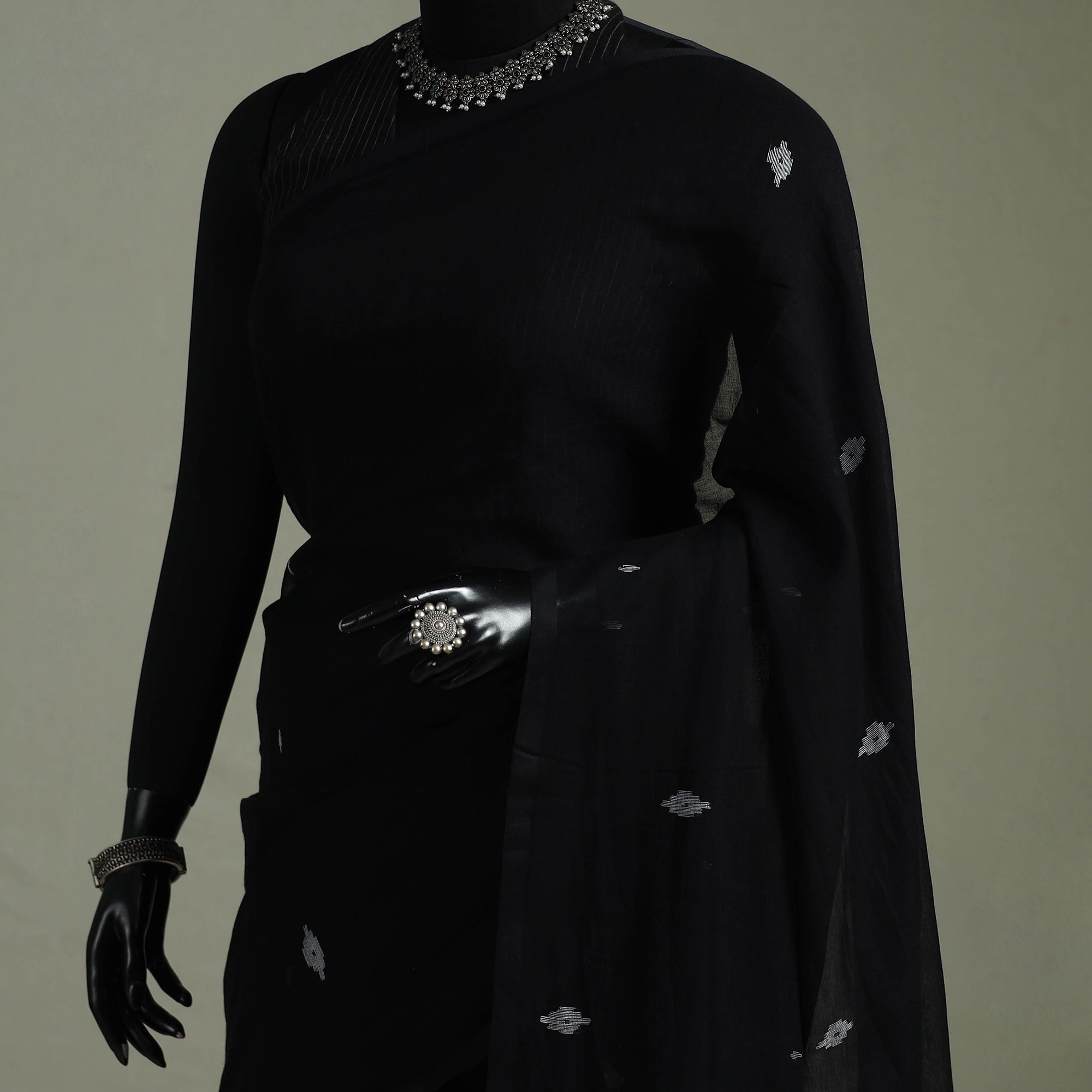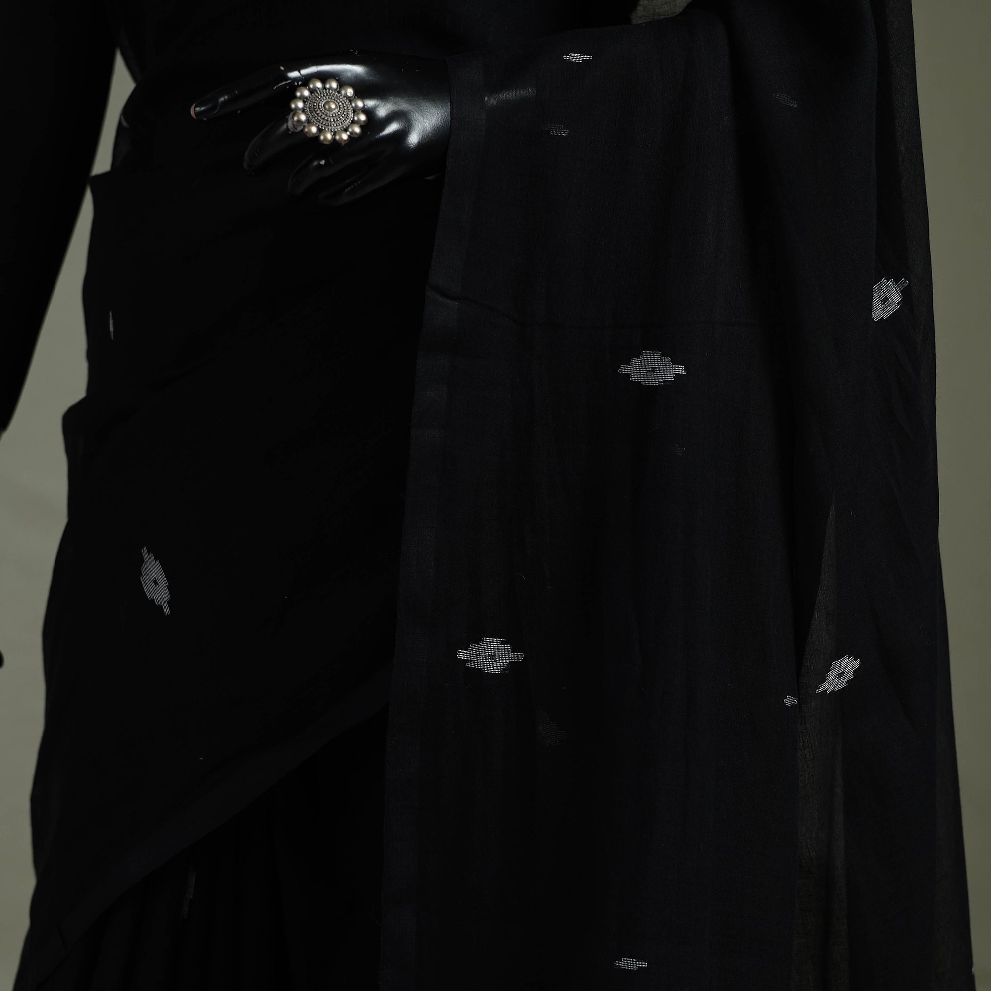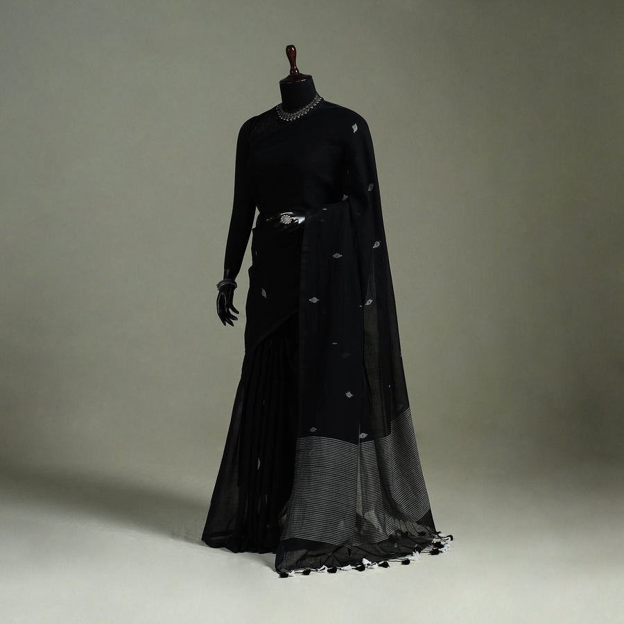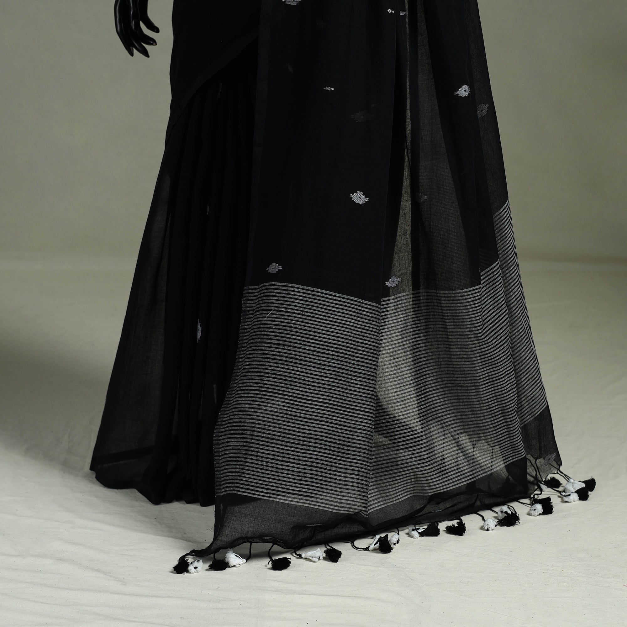Handwoven jamdani pure mul cotton saree from Phulia, West Bengal, reflects the artistry of skilled Bengali artisans who continue one of the oldest weaving traditions of the region. Created using the intricate extra-weft Jamdani technique, delicate buti motifs are woven directly on the loom, giving them the appearance of fine embroidery, while tassel details add elegance. Ideal for occasions or everyday wear.