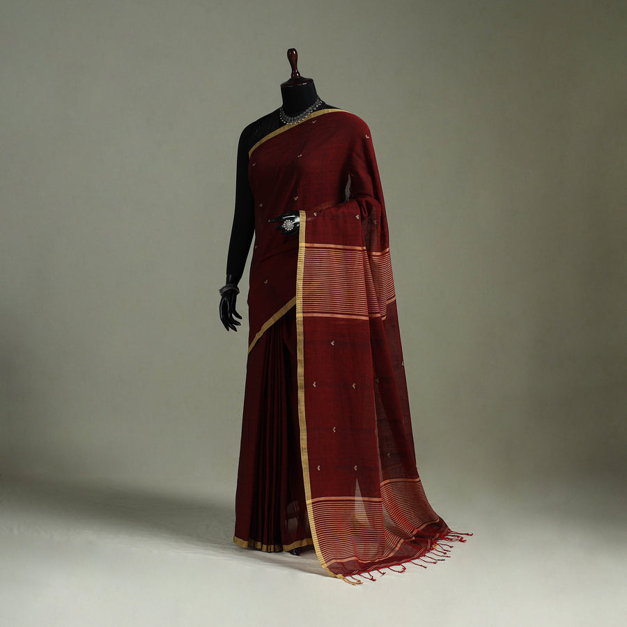Handwoven jamdani pure mul cotton saree from Phulia, West Bengal, reflects the artistry of skilled Bengali artisans who continue one of the oldest weaving traditions of the region. Created using the intricate extra-weft Jamdani technique, delicate buti motifs are woven directly on the loom, giving them the appearance of fine embroidery, while tassel details add elegance. Ideal for occasions or everyday wear.