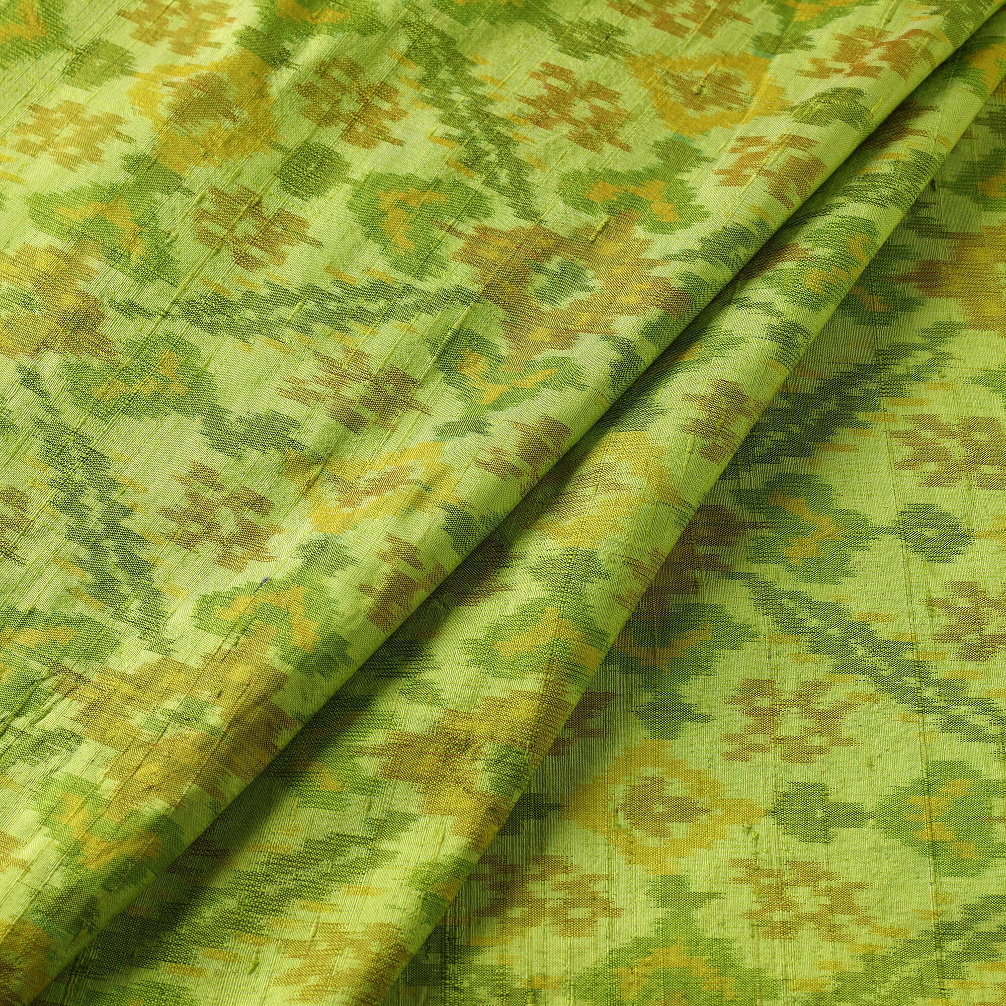 Finest pure handloom green pochampally ikat raw silk fabric from Andhra Pradesh. Ikat (Ikkat) is a dyeing technique used to pattern textiles that employs a resist dyeing process similar to tie-dye on either the warp or weft fibers prior to dyeing. Ikat has lovely patterns in extremely beautiful colours. Ikat fabrics are world famous for their colours, texture and designs, this fabric is ideal for ethnic wear, home décor, or creative sewing projects.