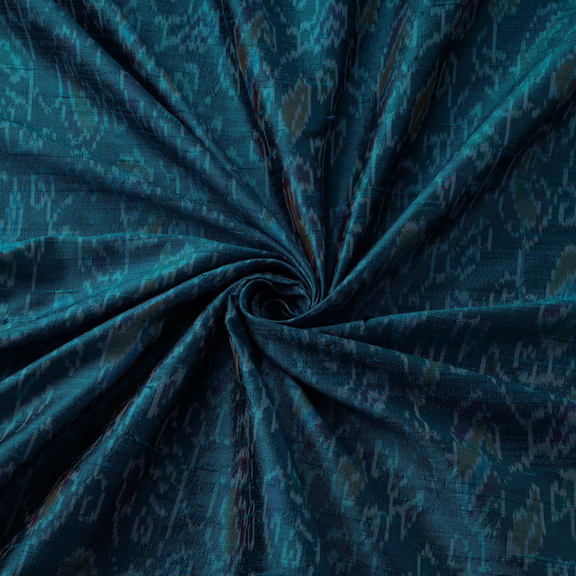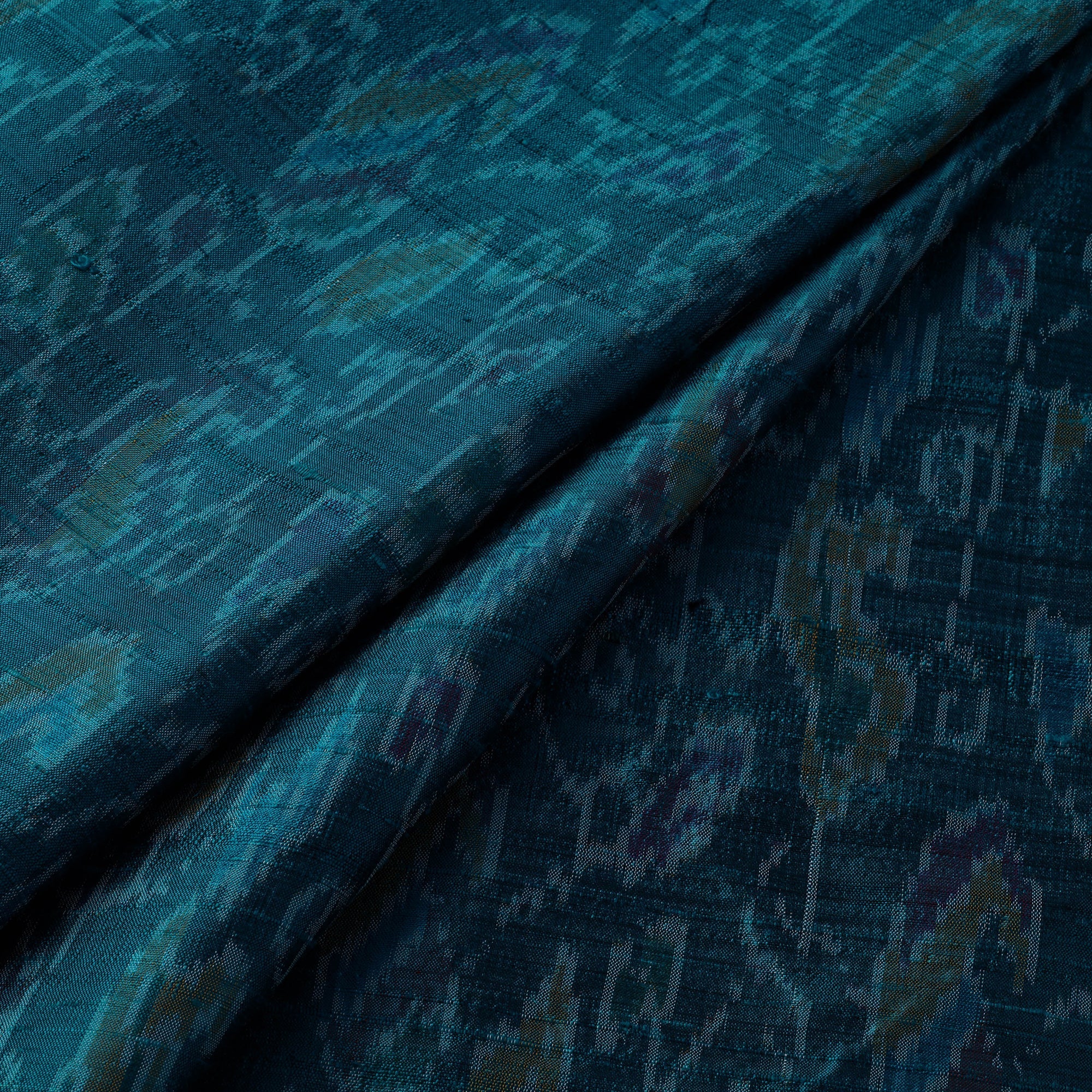 Blue pure handloom pochampally ikat raw silk fabric from Telangana. Created using the Ikat resist-dye technique, where the warp and weft yarns are carefully dyed before weaving, this fabric is ideal for garments as well as creating home decor pieces.