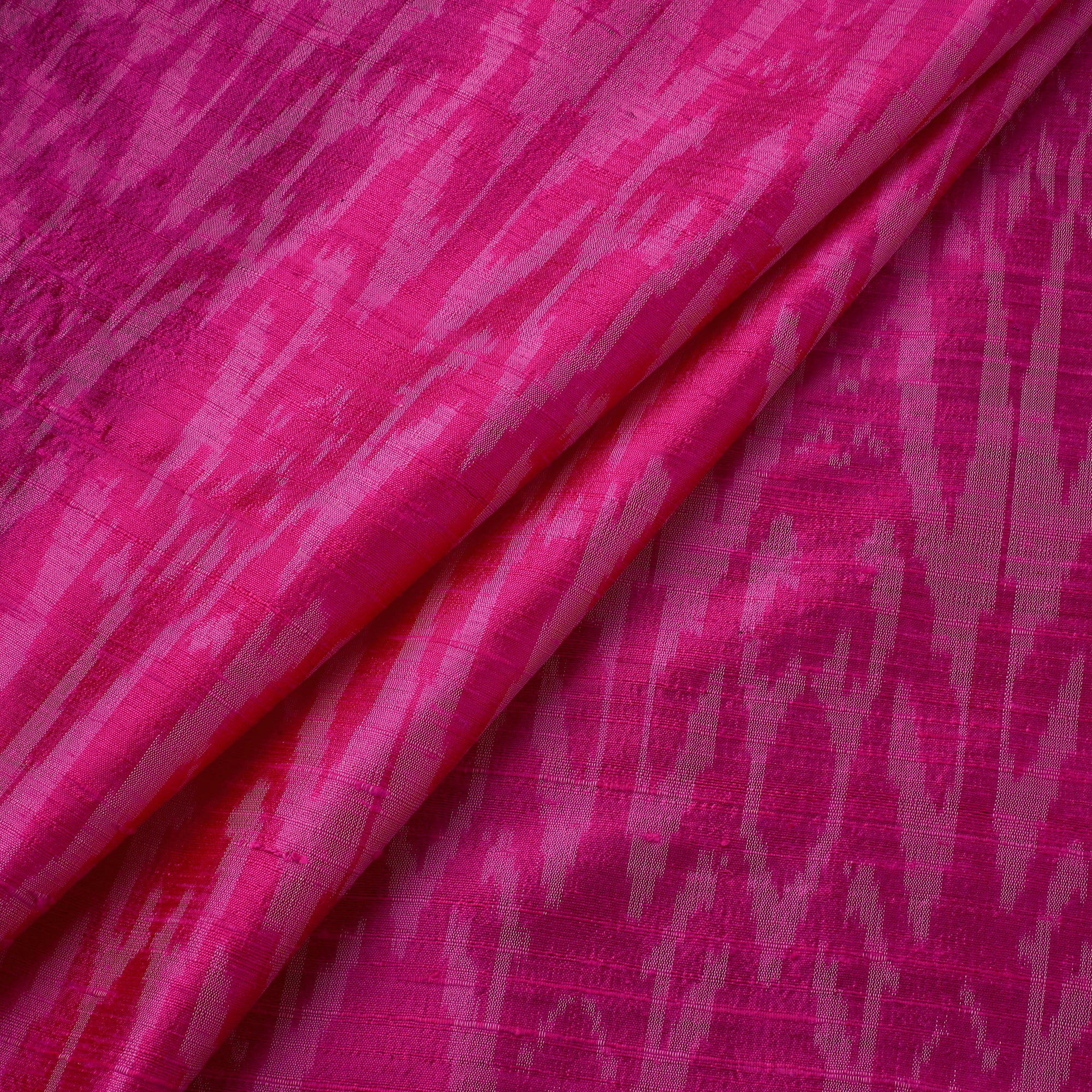 Pure handloom pochampally ikat raw silk fabric from Telangana, woven by skilled artisans. Ikat fabrics come from a small town called pochampally close to Telangana. It is a handloom hub surrounded by lush verdant green hills. Ikat is an ancient technique that creates patterns on yarn through the laborious process of resisting segments of the yarn through tying. These carefully calculated, tied yarns are then dyed to create patterns. The yarn may then be used in the warp or weft or both to create beautifully patterned, distinct woven textiles. A tie & dye technique thread by thread which when placed together in a mathematical precision begin to create motifs on the fabric. Suitable for garments & home decor.