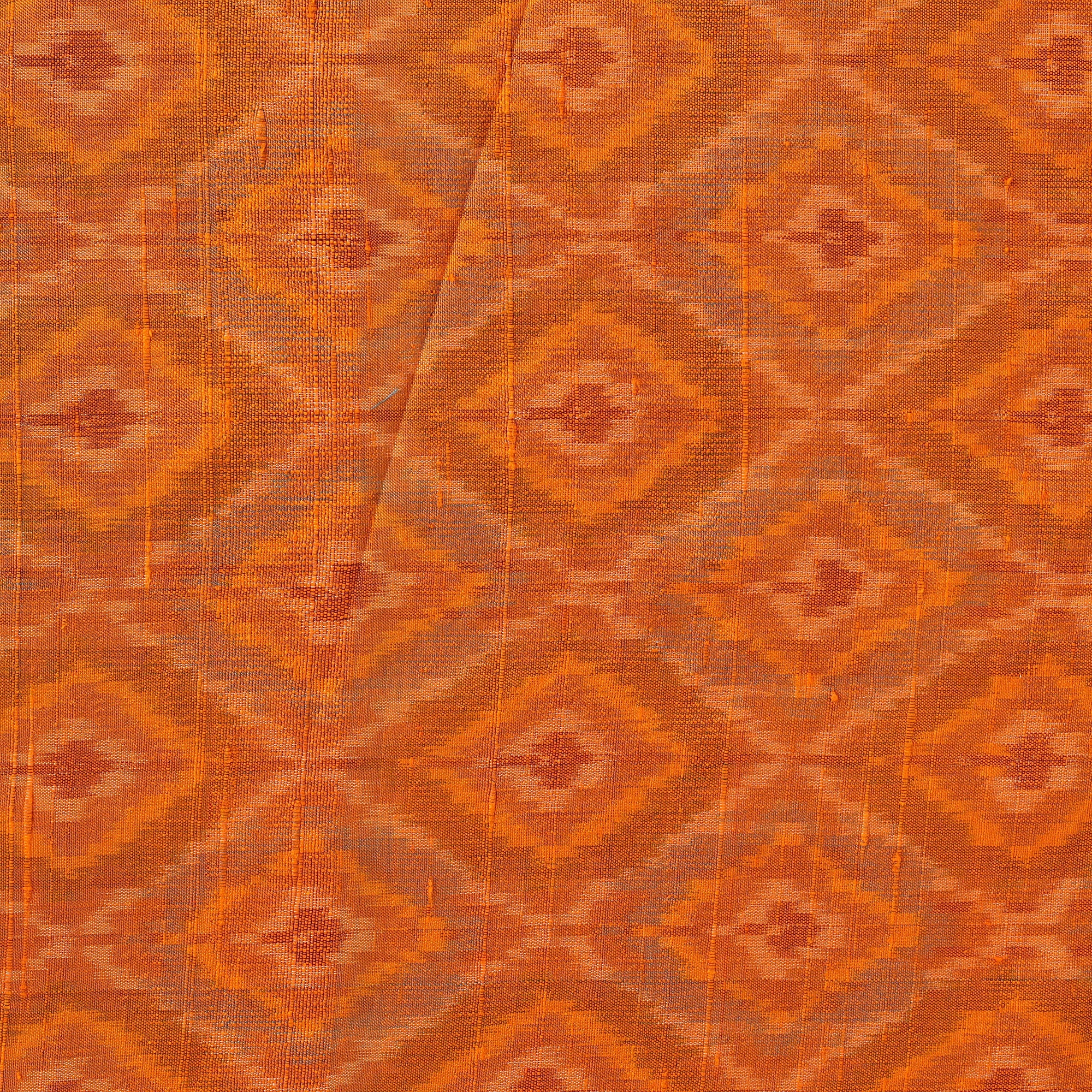Finest pure handloom orange pochampally ikat raw silk fabric from Andhra Pradesh. Ikat (Ikkat) is a dyeing technique used to pattern textiles that employs a resist dyeing process similar to tie-dye on either the warp or weft fibers prior to dyeing. Ikat has lovely patterns in extremely beautiful colours. Ikat fabrics are world famous for their colours, texture and designs, this fabric is ideal for ethnic wear, home décor, or creative sewing projects.
