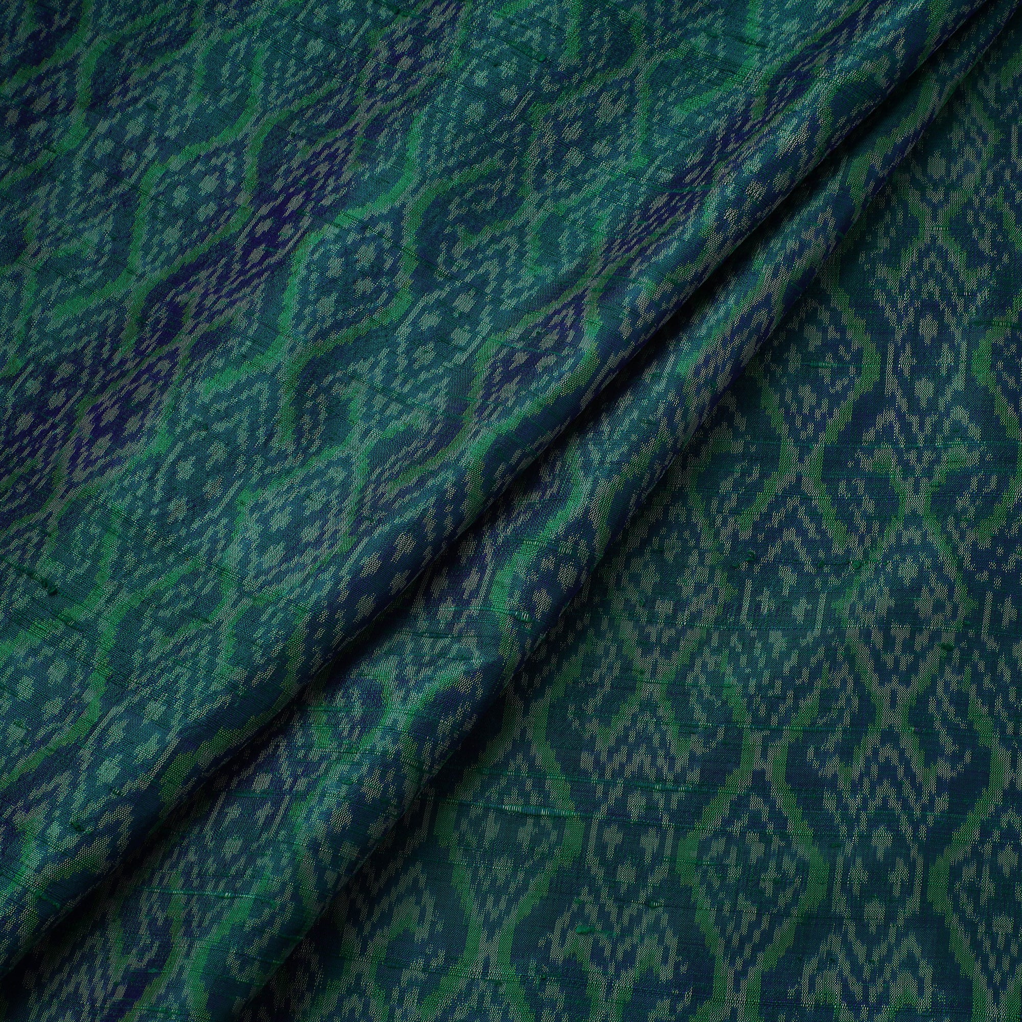 Pure handloom pochampally ikat raw silk fabric from Telangana, woven by skilled artisans. Ikat fabrics come from a small town called pochampally close to Telangana. It is a handloom hub surrounded by lush verdant green hills. Ikat is an ancient technique that creates patterns on yarn through the laborious process of resisting segments of the yarn through tying. These carefully calculated, tied yarns are then dyed to create patterns. The yarn may then be used in the warp or weft or both to create beautifully patterned, distinct woven textiles. A tie & dye technique thread by thread which when placed together in a mathematical precision begin to create motifs on the fabric. Suitable for garments & home decor.