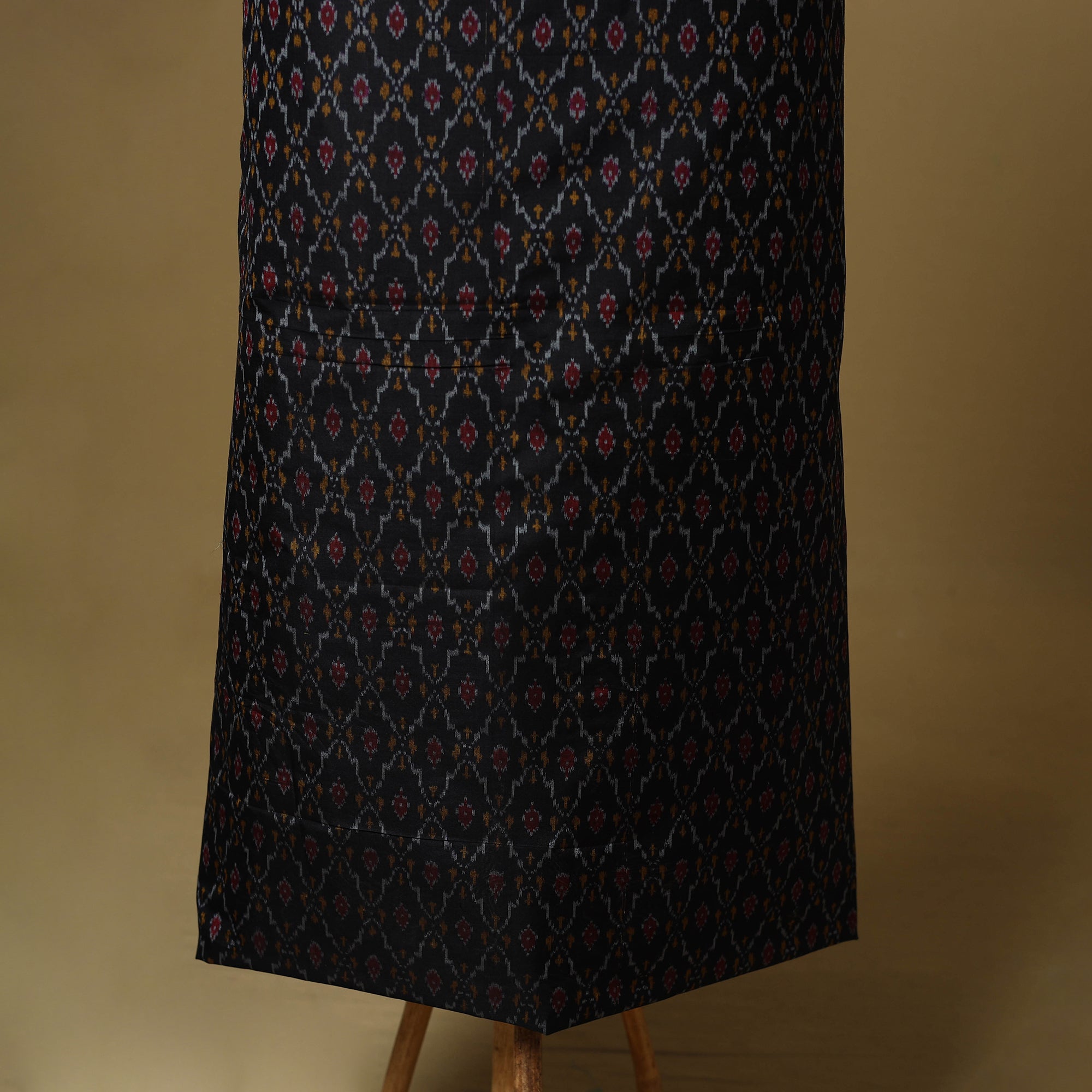 Black 2pc unstitched sico silk cotton handloom pochampally ikat dress material is woven by skilled weavers with each thread resist-dyed before weaving to create vibrant, intricate patterns. The set includes a silk-cotton kurta fabric and a matching dupatta with zari border and tassels. Combining silk’s sheen with cotton’s comfort, it drapes beautifully perfect for crafting graceful ethnic wear.