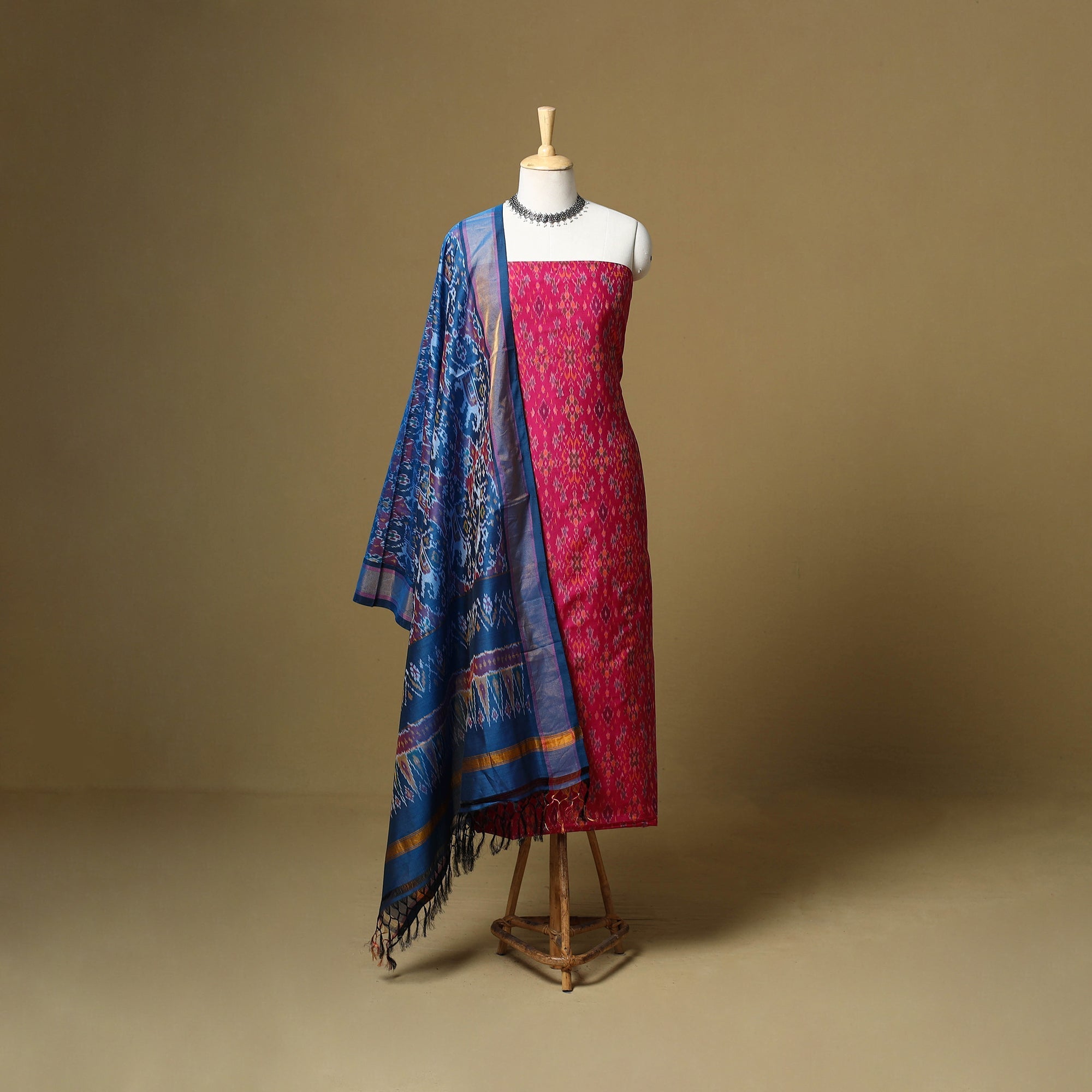 Pink 2pc unstitched sico silk cotton handloom pochampally ikat dress material is woven by skilled weavers with each thread resist-dyed before weaving to create vibrant, intricate patterns. The set includes a silk-cotton kurta fabric and a matching dupatta with zari border and tassels. Combining silk’s sheen with cotton’s comfort, it drapes beautifully perfect for crafting graceful ethnic wear.