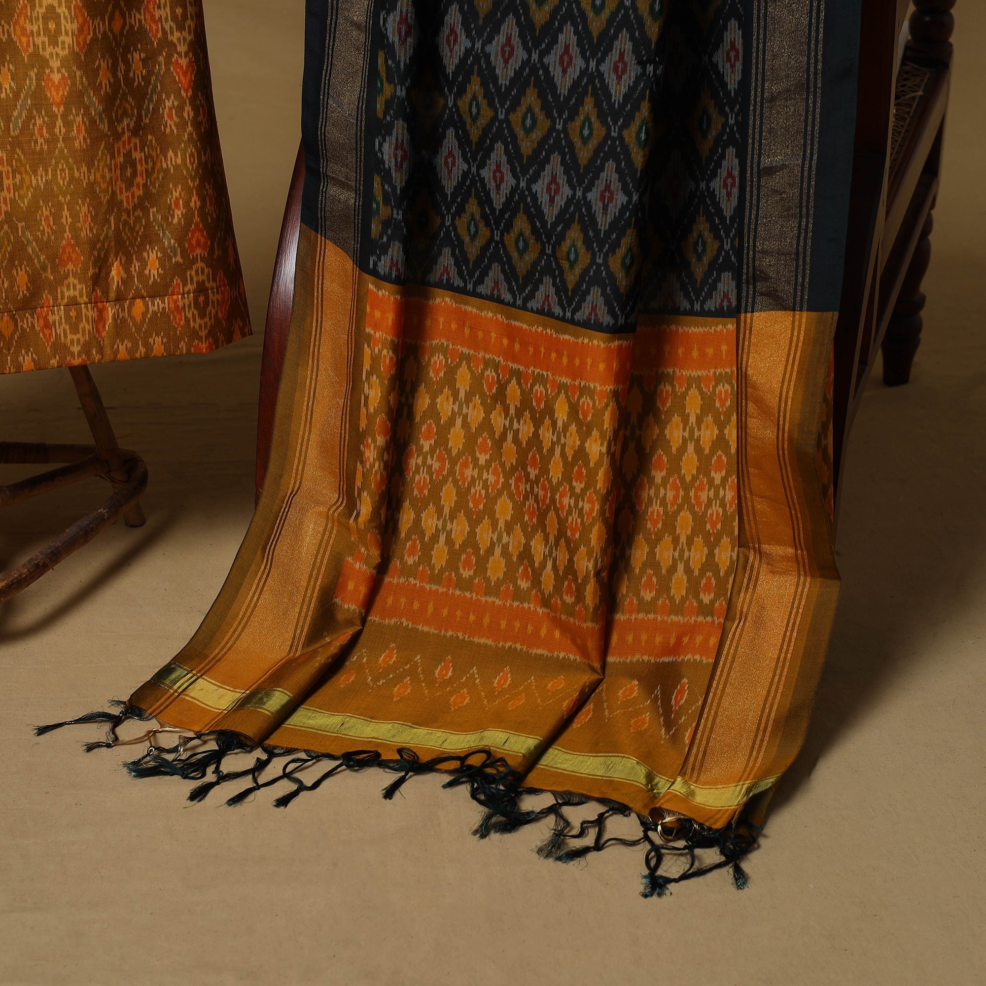 Pochampally ikat sico silk-cotton 2pc unstitched dress material is woven by skilled weavers in Telangana where each thread is resist dyed before weaving to form intricate patterns. The set included a kurta fabric and dupatta with zari border and tassels. Perfect for weddings or graceful everyday wear.