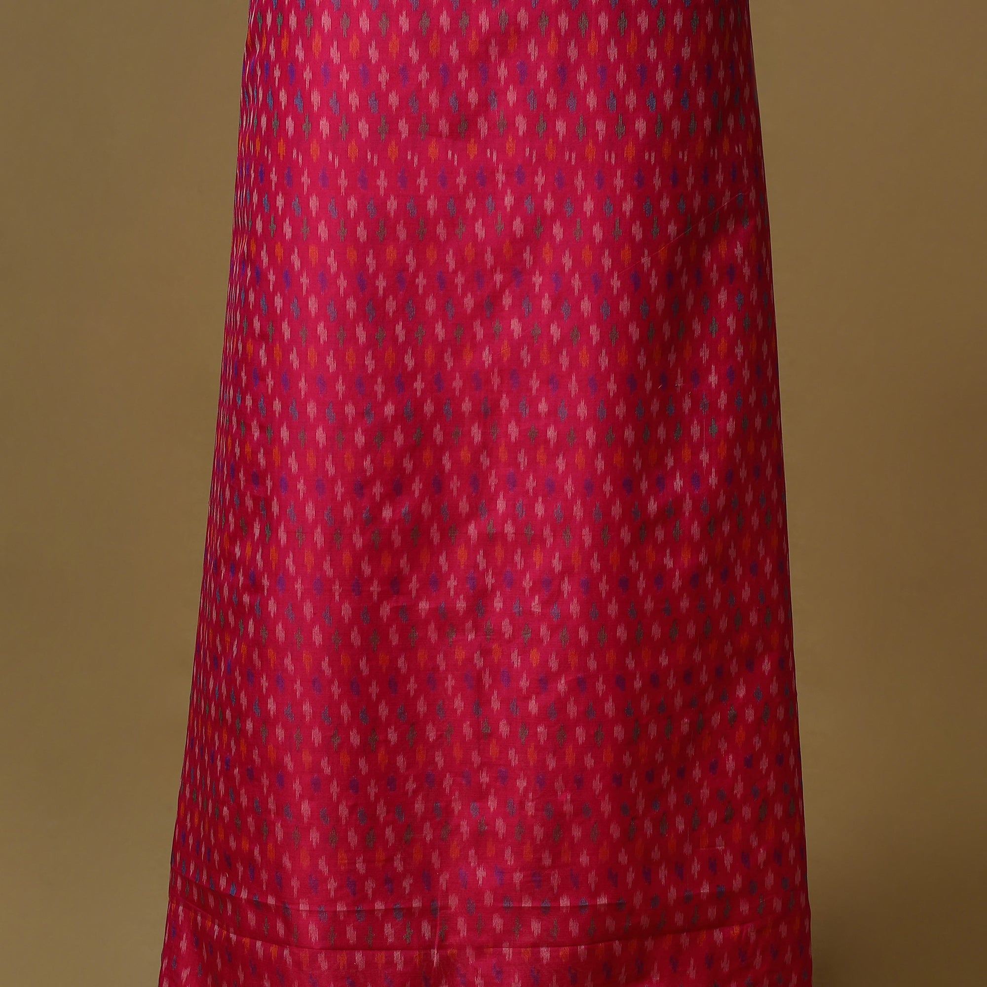 Pochampally ikat sico silk-cotton 2pc unstitched dress material is woven by skilled weavers in Telangana where each thread is resist dyed before weaving to form intricate patterns. The set included a kurta fabric and dupatta with zari border and tassels. Perfect for weddings or graceful everyday wear.