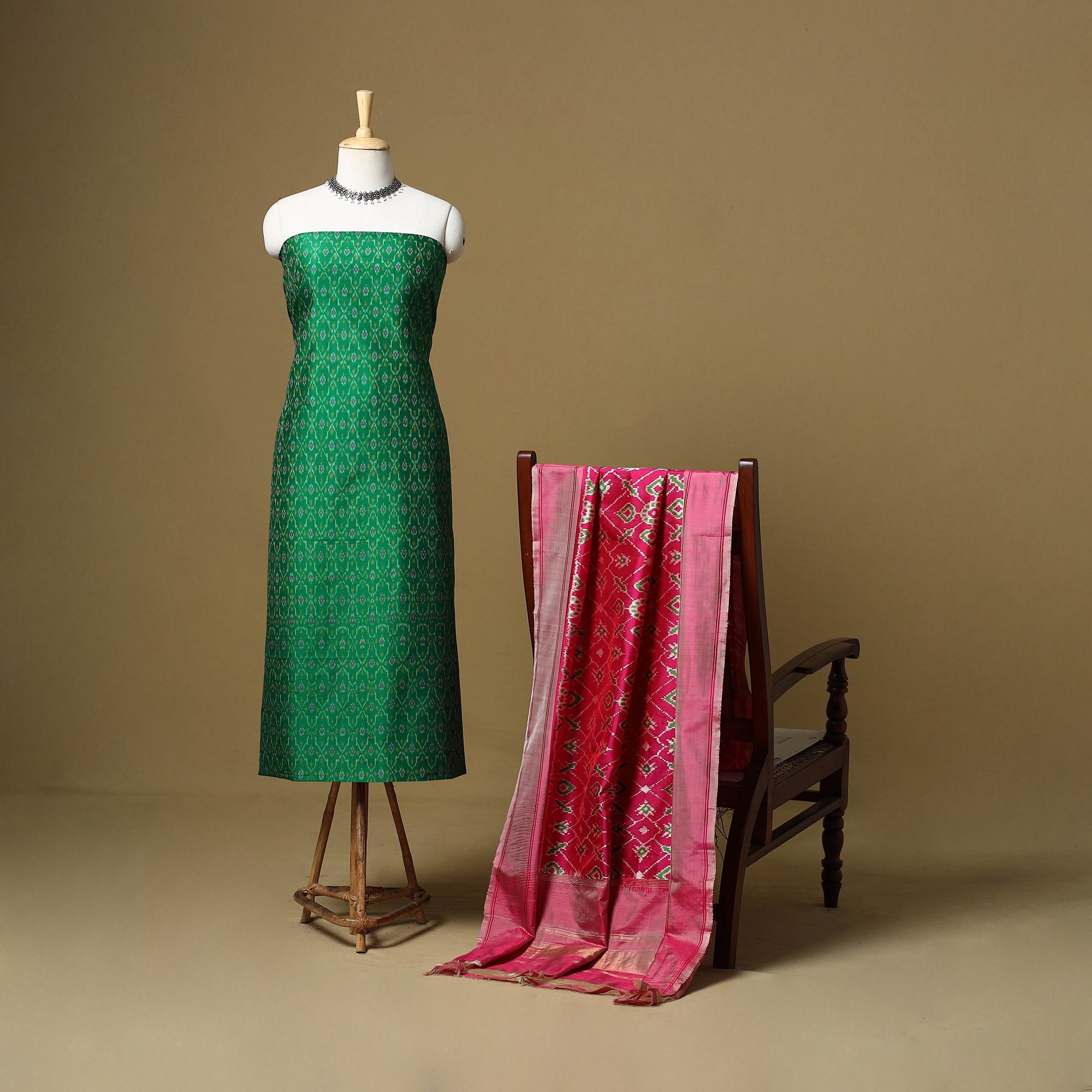 Green 2pc unstitched sico silk cotton handloom pochampally Ikat dress material is woven by skilled weavers, with each thread resist-dyed before weaving to create vibrant, intricate patterns. The set includes a sico silk-cotton kurta fabric and a matching mulberry silk dupatta with zari border. Combining silk’s sheen with cotton’s comfort, it drapes beautifully perfect for crafting graceful ethnic wear.