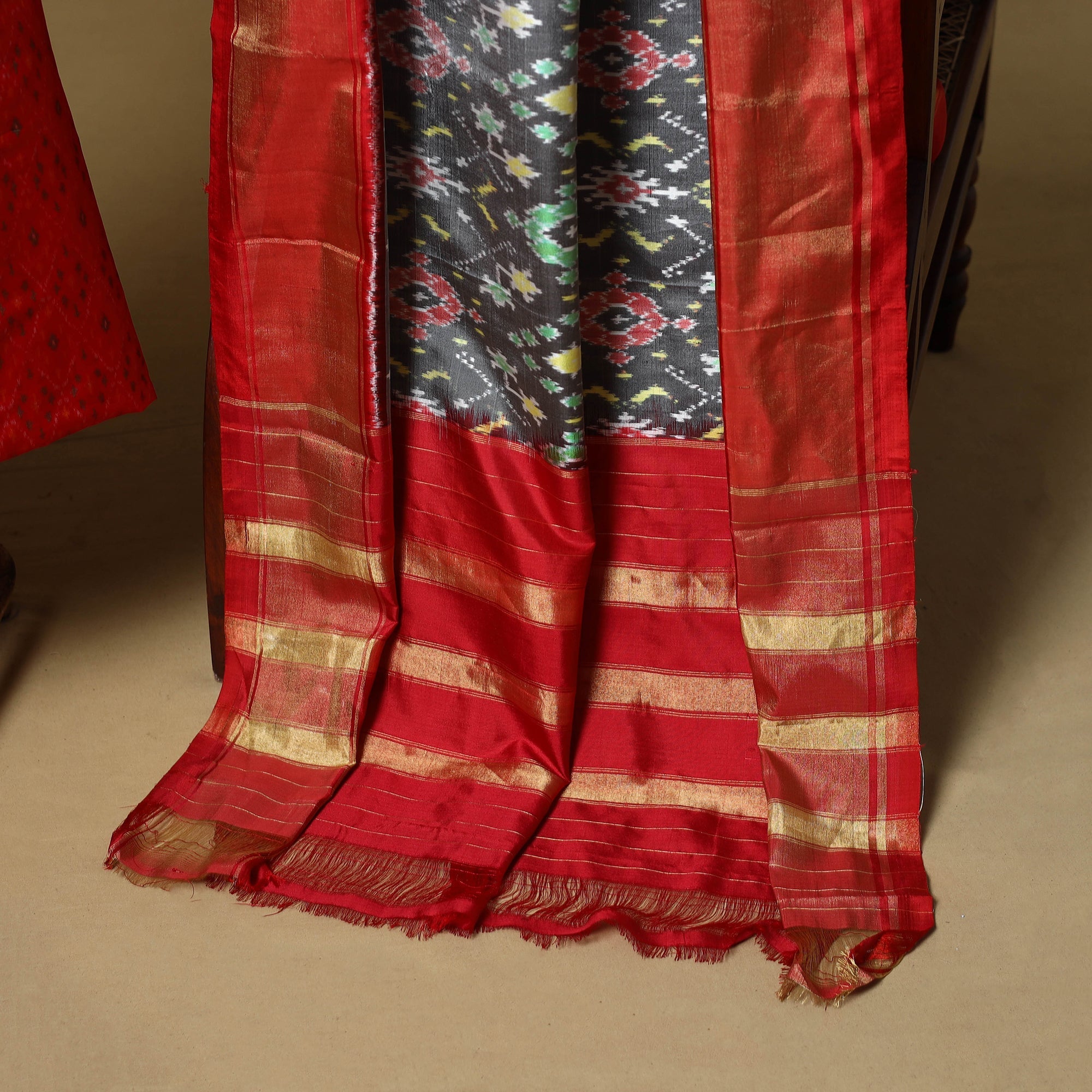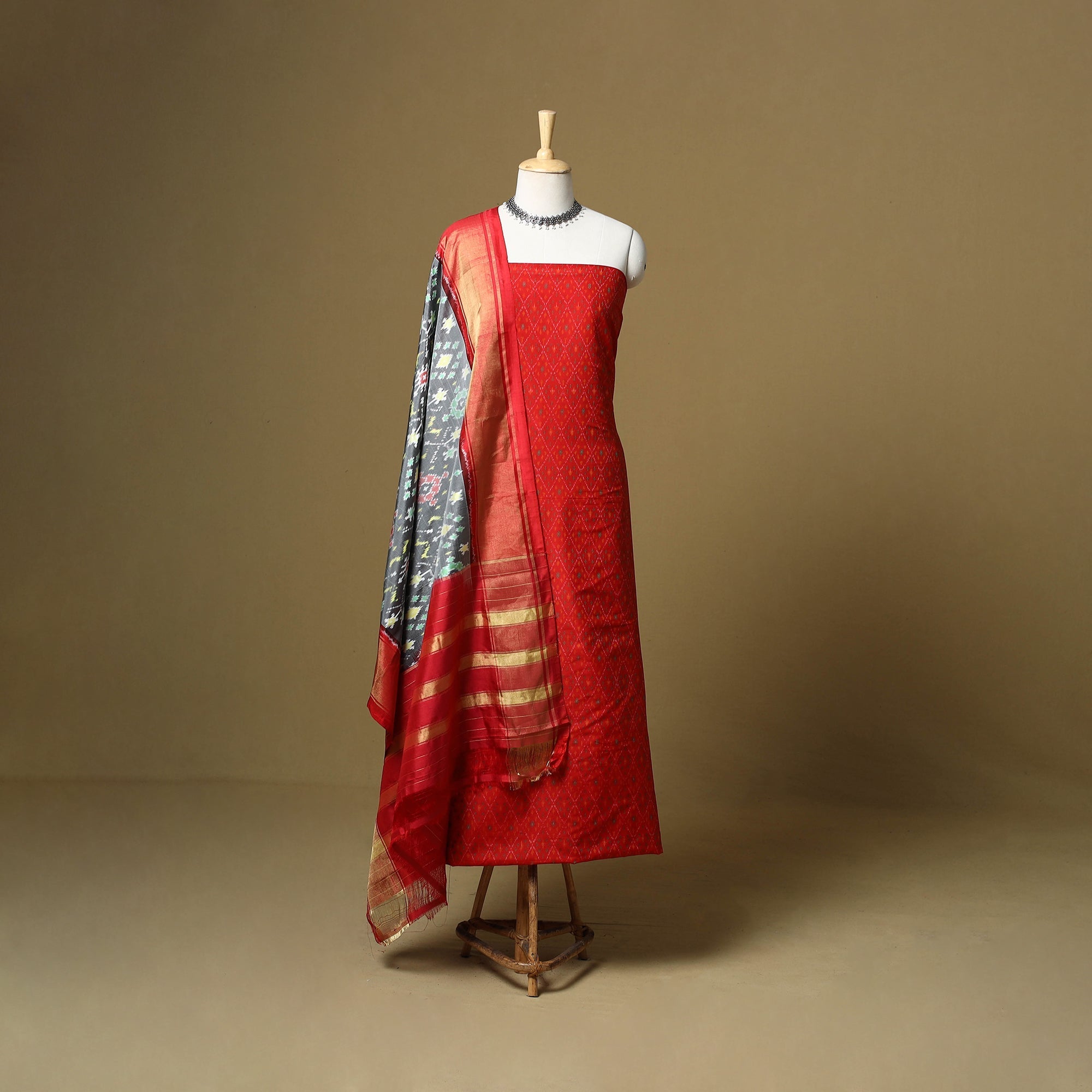 Red 2pc unstitched sico silk cotton handloom pochampally Ikat dress material is woven by skilled weavers, with each thread resist-dyed before weaving to create vibrant, intricate patterns. The set includes a sico silk-cotton kurta fabric and a matching mulberry silk dupatta with zari border. Combining silk’s sheen with cotton’s comfort, it drapes beautifully perfect for crafting graceful ethnic wear.