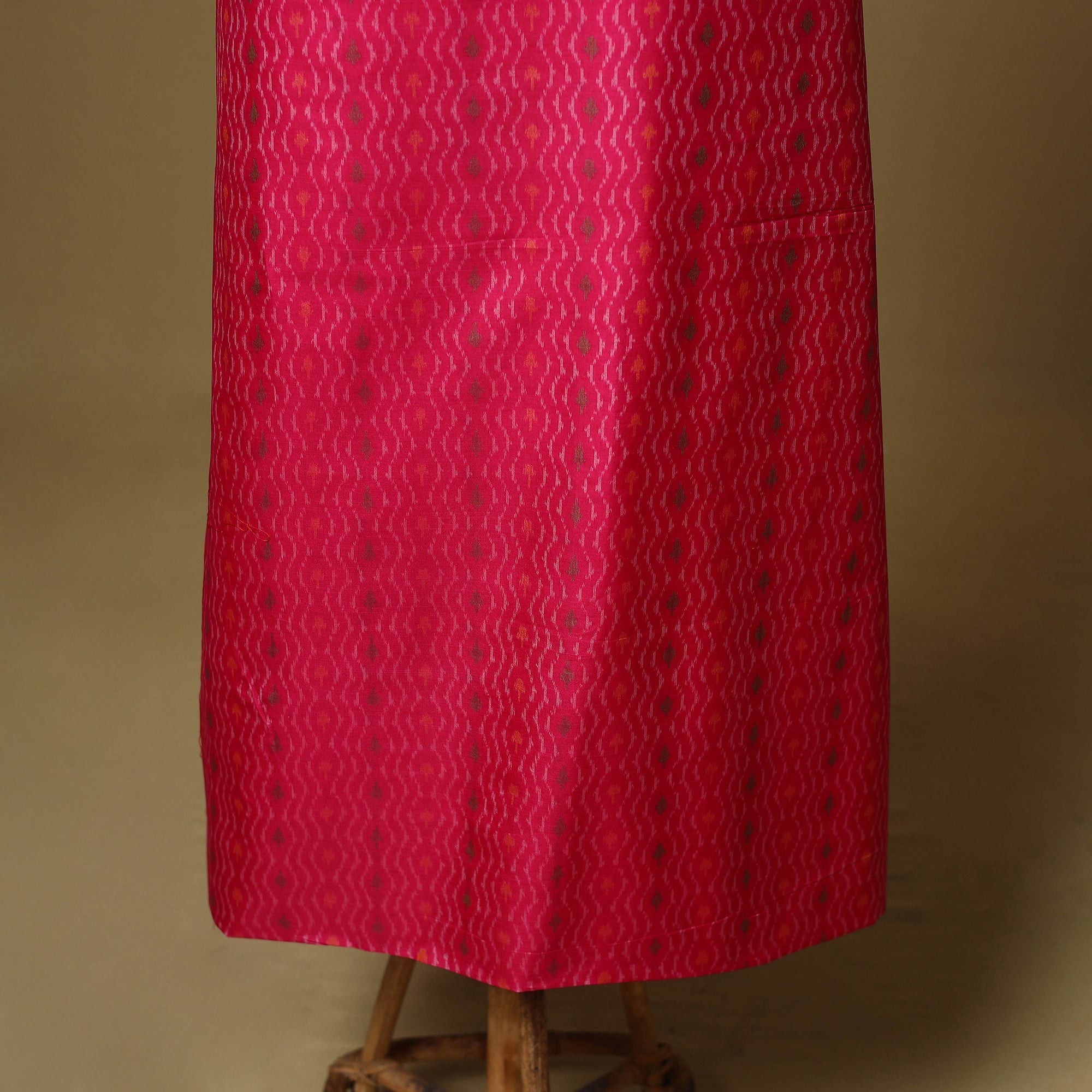 Pink 2pc unstitched sico silk cotton handloom pochampally Ikat dress material is woven by skilled weavers, with each thread resist-dyed before weaving to create vibrant, intricate patterns. The set includes a sico silk-cotton kurta fabric and a matching mulberry silk dupatta with zari border. Combining silk’s sheen with cotton’s comfort, it drapes beautifully perfect for crafting graceful ethnic wear.