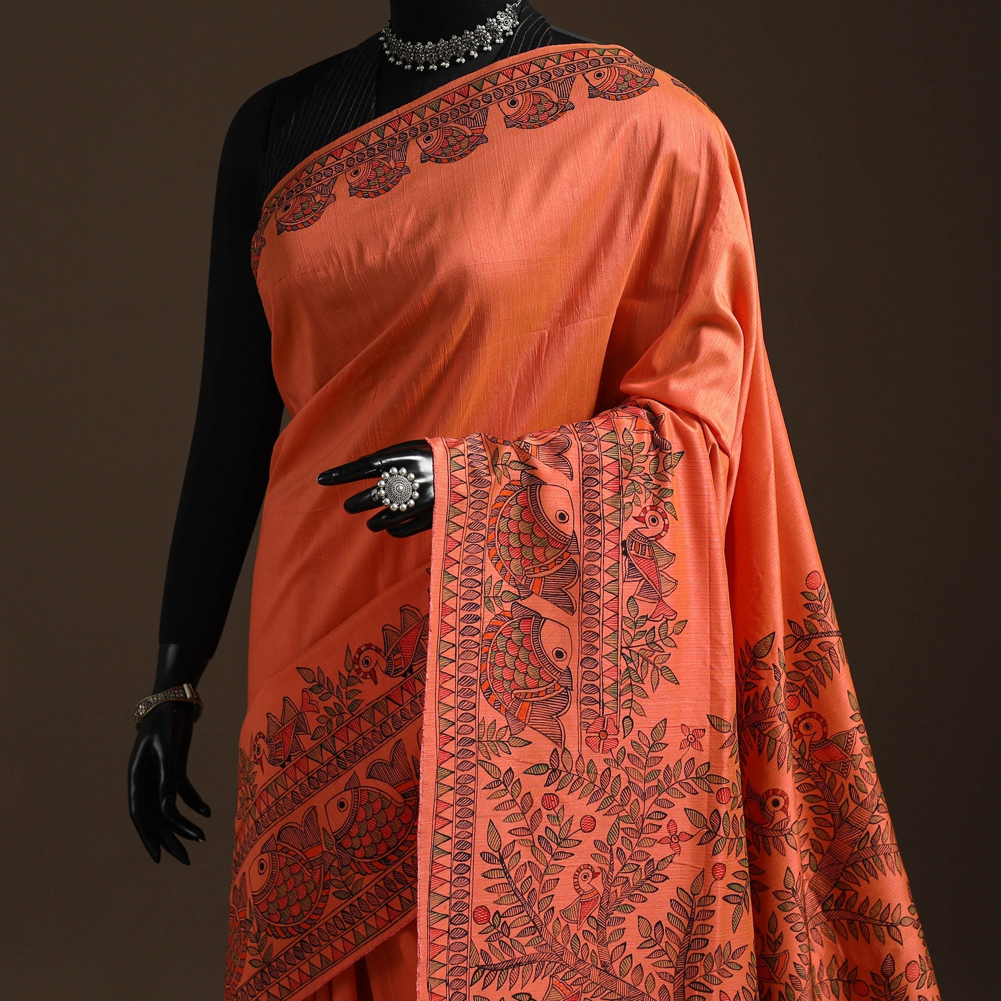 Authentic orange handloom silk cotton hand-painted Madhubani saree by artisan Hira Devi from Bihar. Graceful, Elegant, Durable Saree handpainted with love. Madhubani paintings are famous for motifs and designs based on nature and gods, a widely celebrated art artform worldwide.