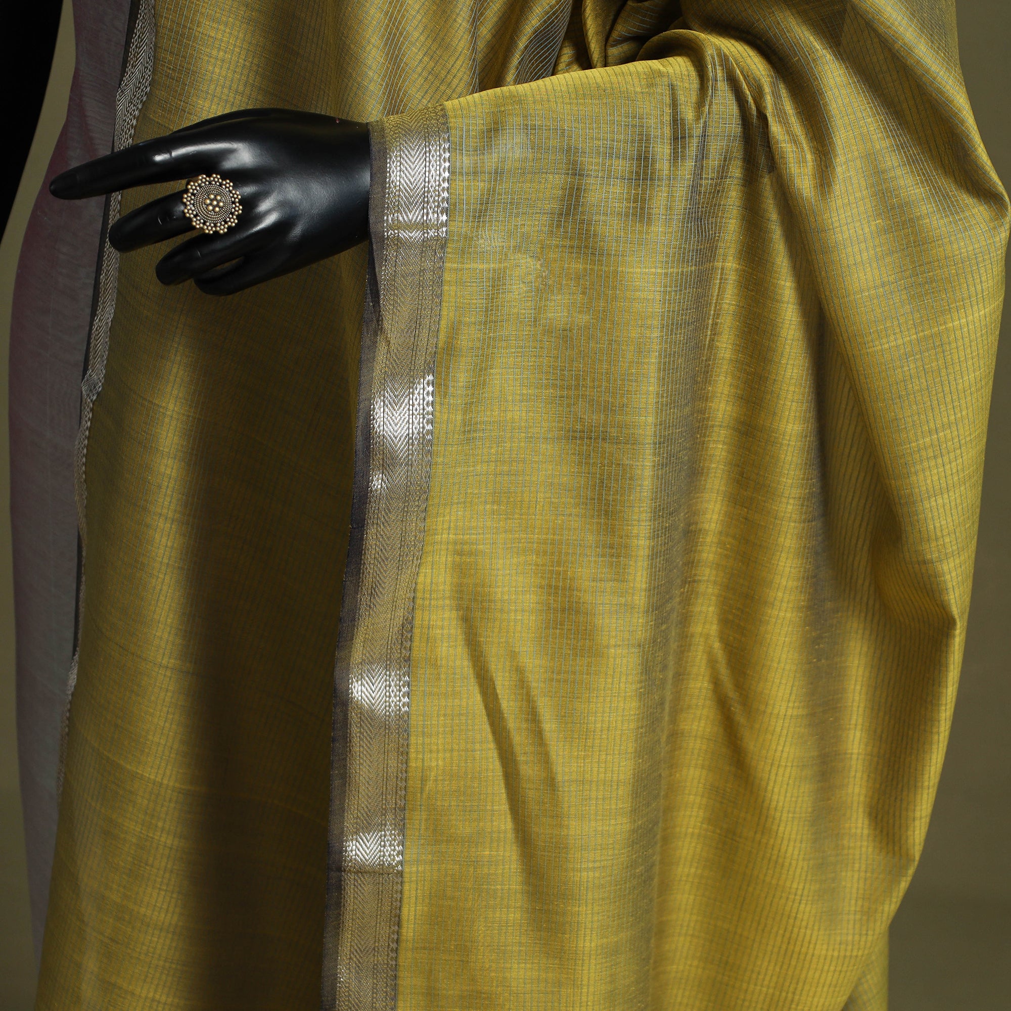 This yellow handloom silk-cotton maheshwari dupatta is woven with a legacy rooted in centuries of tradition. Featuring a delicate zari border, it offers a timeless appeal. The fabric is light, airy, and soft to the touch, lending effortless grace when draped. Crafted by skilled weavers from Maheshwar, it reflects generations of artistry and brings refined charm to any