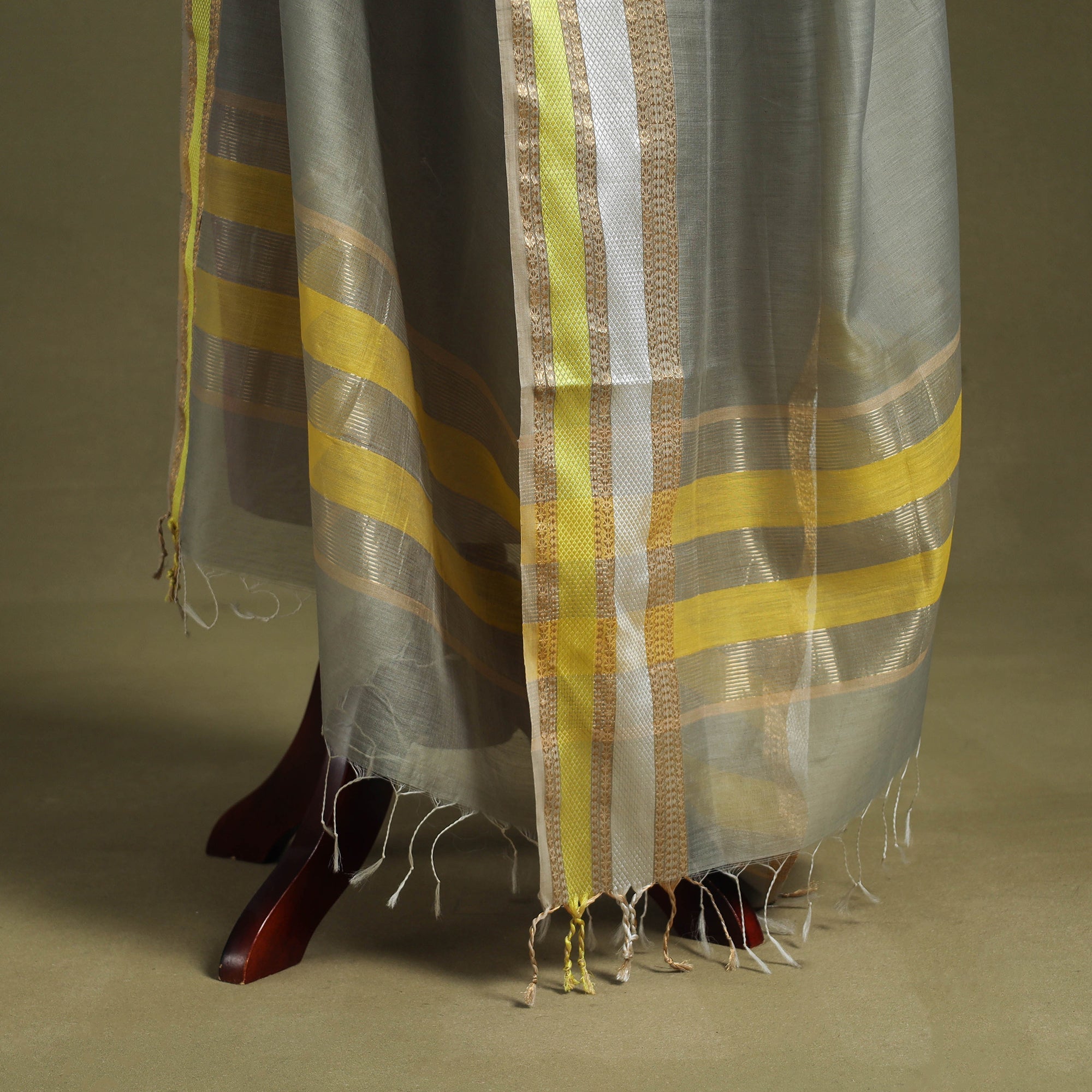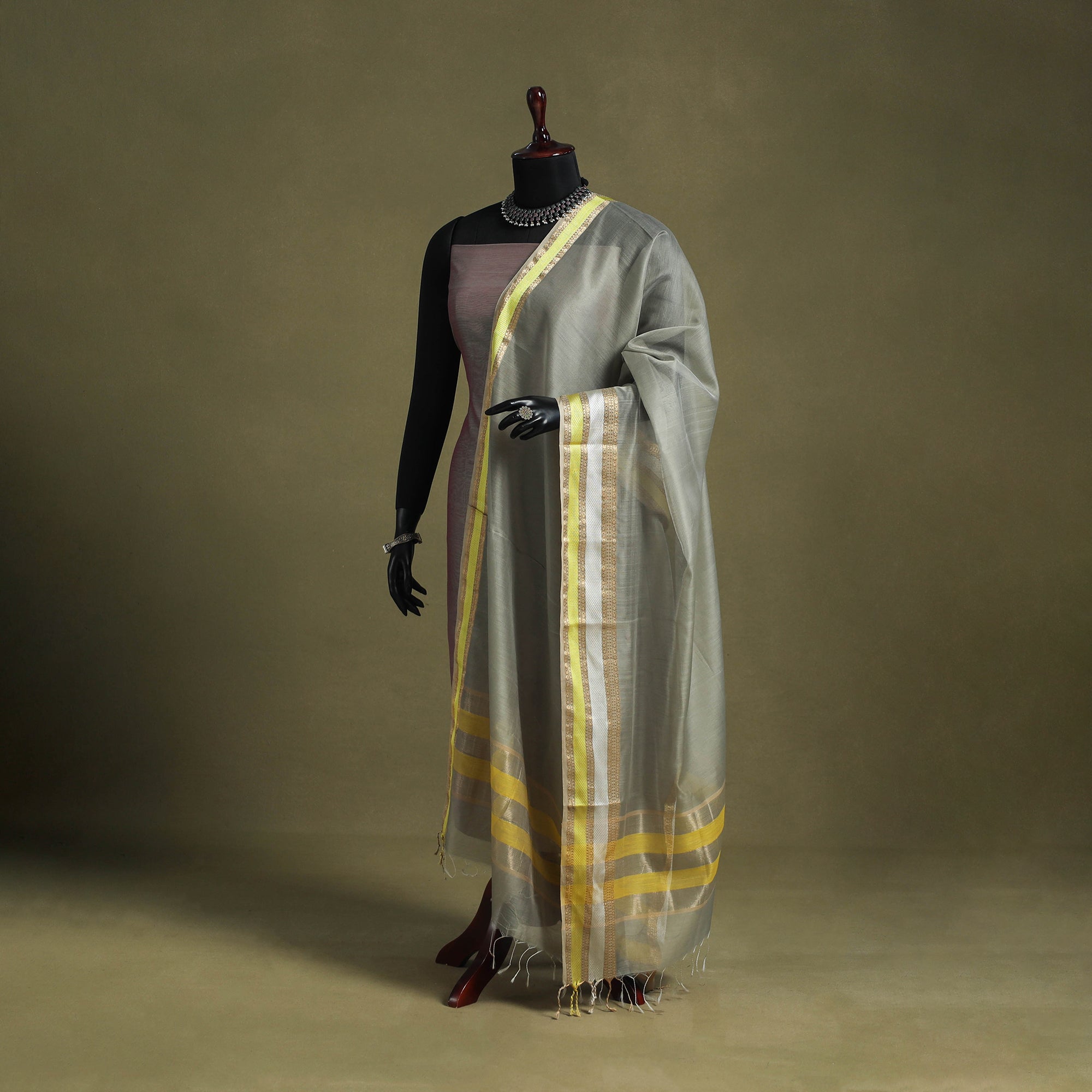 This grey handloom silk-cotton maheshwari dupatta is made with a long tradition of weaving. It has a beautiful zari & resham border that gives it a classic look. The fabric is light, soft, and sheer, making it easy to wear and graceful in style. Woven by families who have been practicing this craft for generations, it reflects the rich weaving heritage of Maheshwar and adds simple elegance to any outfit.