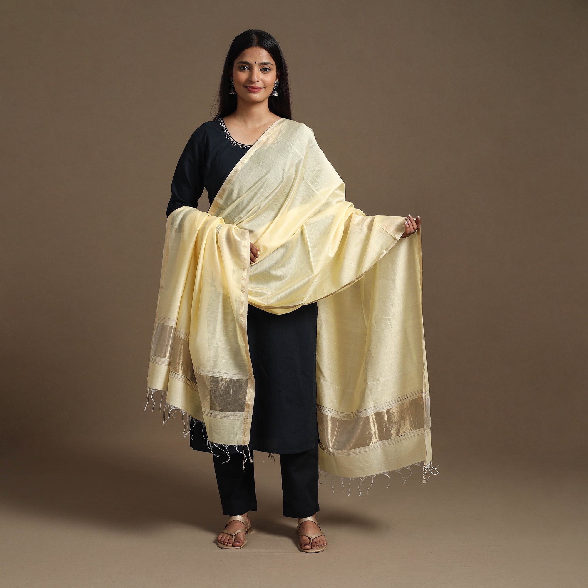 This yellow handloom silk cotton maheshwari dupatta with zari border, is a masterpiece of traditional weaving techniques passed down through generations of skilled artisans in Maheshwar. Its lightweight, sheer texture exudes unparalleled elegance, adding grace to any attire.