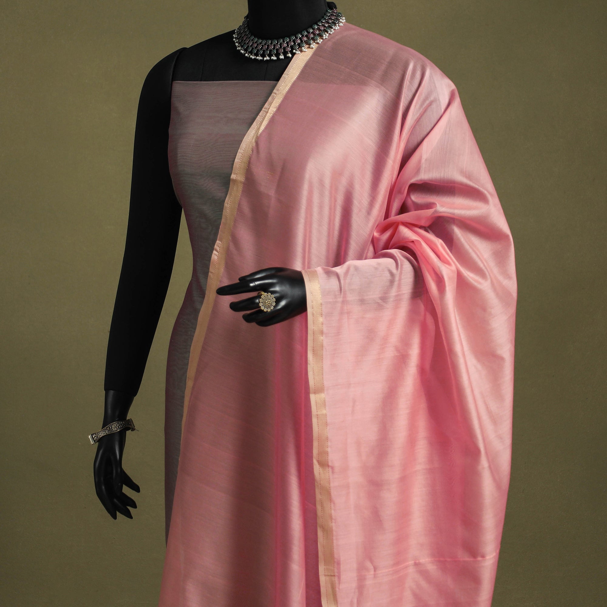 This pink handloom silk-cotton maheshwari dupatta is made with a long tradition of weaving. It has a beautiful zari border that gives it a classic look. The fabric is light, soft, and sheer, making it easy to wear and graceful in style. The pallu features a subtle gicha stripe, adding a textured highlight without overpowering the design. Woven by families practicing this craft for generations, it reflects the rich weaving heritage of Maheshwar and adds simple elegance to any outfit.