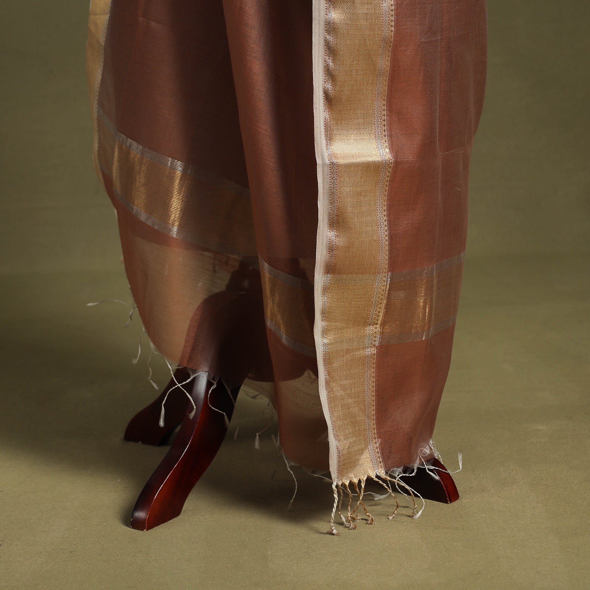 This brown handloom silk-cotton maheshwari dupatta is woven with a legacy rooted in centuries of tradition. Featuring a delicate zari border, it offers a timeless appeal. The fabric is light, airy, and soft to the touch, lending effortless grace when draped. Crafted by skilled weavers from Maheshwar, it reflects generations of artistry and brings refined charm to any