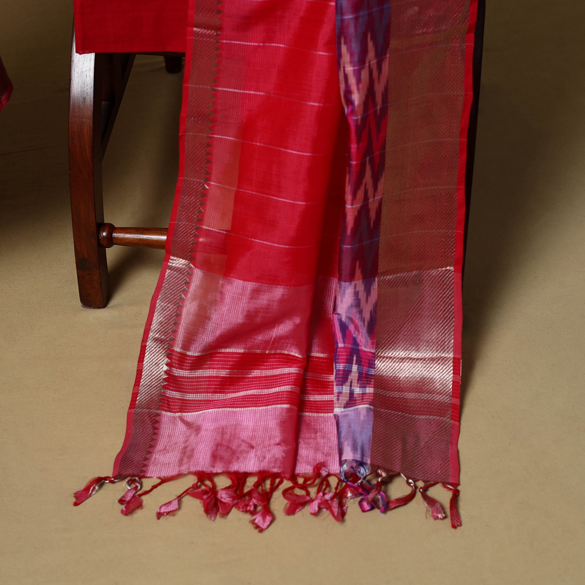 3pc original mangalagiri handloom cotton unstitched dress material set from Andhra Pradesh. Woven using the traditional Mangalagiri technique known for its fine texture and zari borders. To enhance its look further, the border features ikat weaving. This set beautifully blends simplicity with elegance. It includes a kurta, a matching plain bottom, and a missing checks dupatta. Perfect for festive occasions or effortless everyday styling.