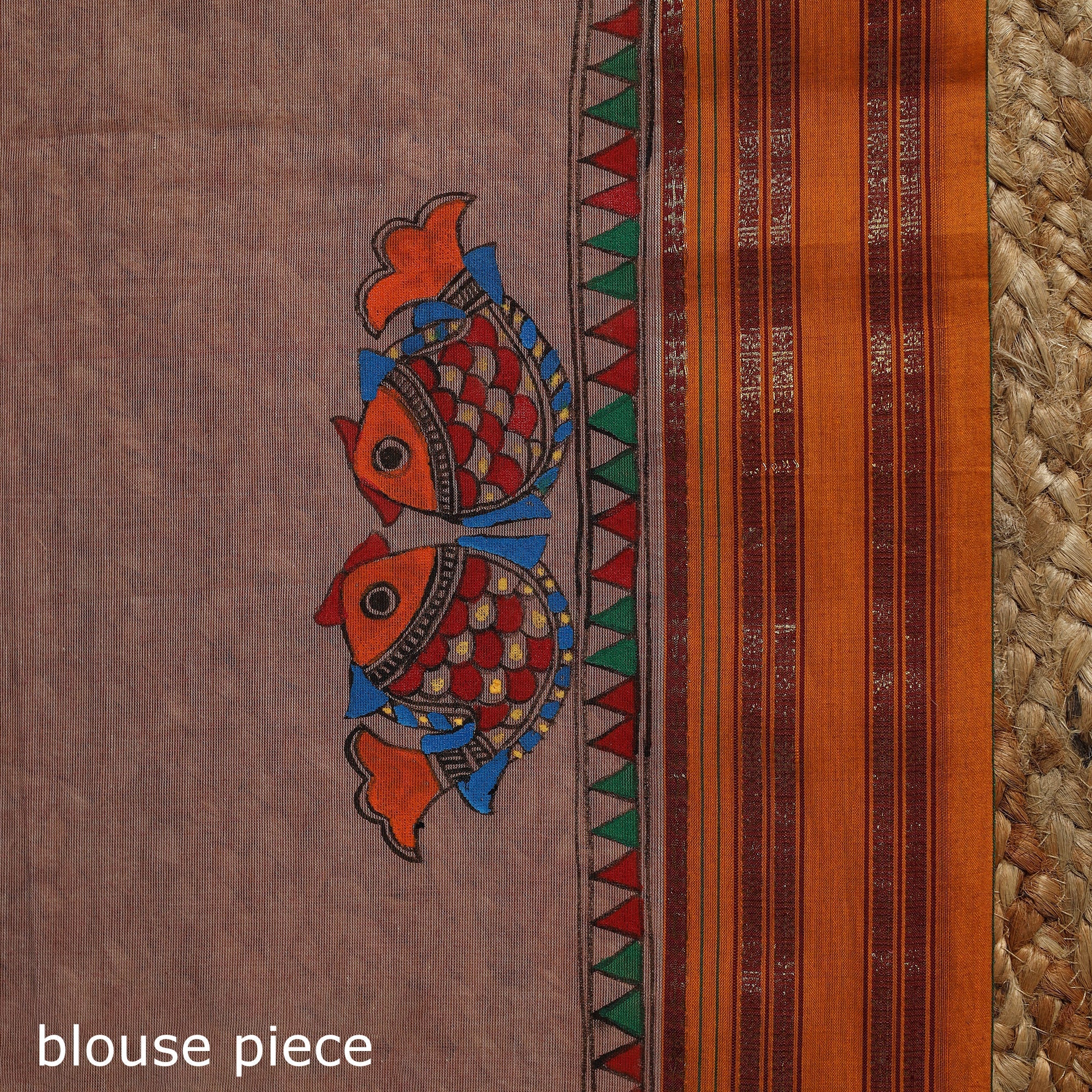 Authentic brown handloom silk cotton hand-painted Madhubani saree by artisan Hira Devi from Bihar. Graceful, Elegant, Durable Saree handpainted with love. Madhubani paintings are famous for motifs and designs based on nature and gods, a widely celebrated art artform worldwide.