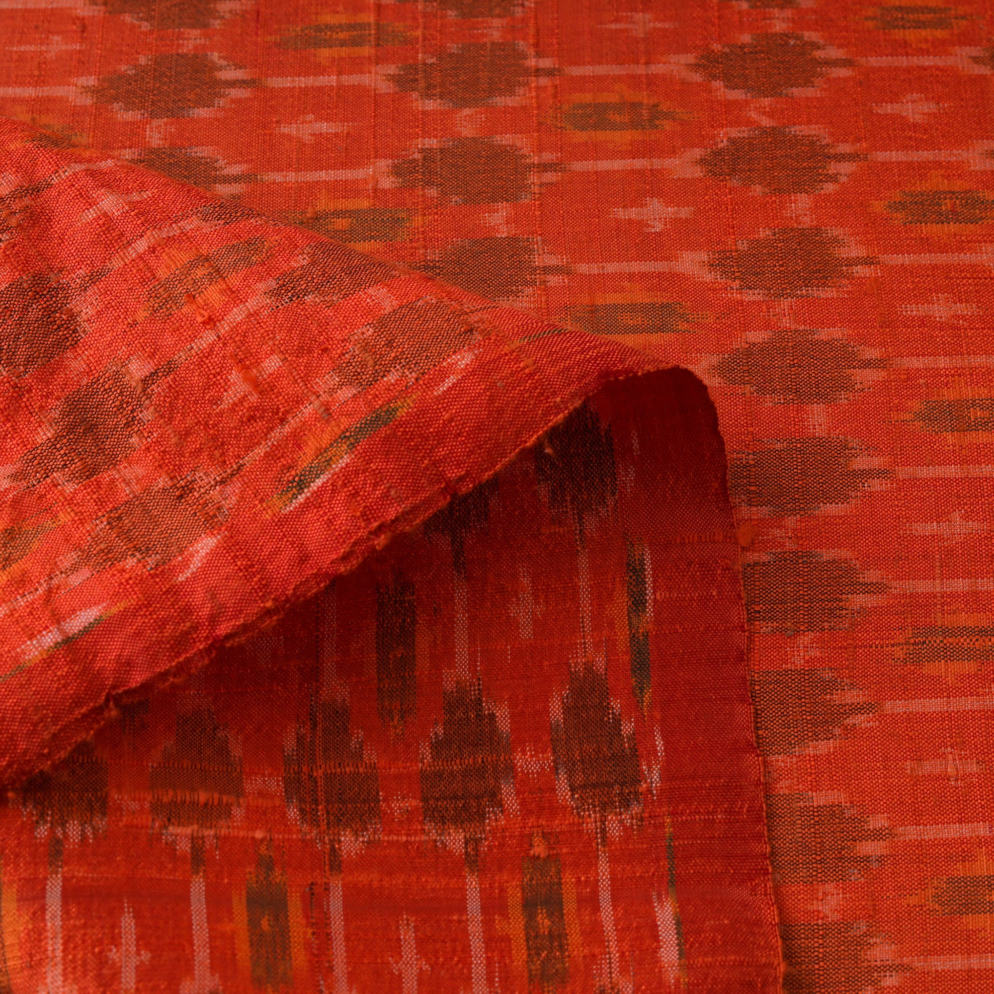 This finest-quality orange pochampally ikat weave handloom fabric is crafted from pure raw silk, sourced from Telangana. Ikat (Ikkat) is a dyeing technique used to pattern textiles that employs a resist dyeing process similar to tie-dye on either the warp or weft fibers prior to dyeing. Its rich texture and quality make it a sought-after choice for exquisite textiles.