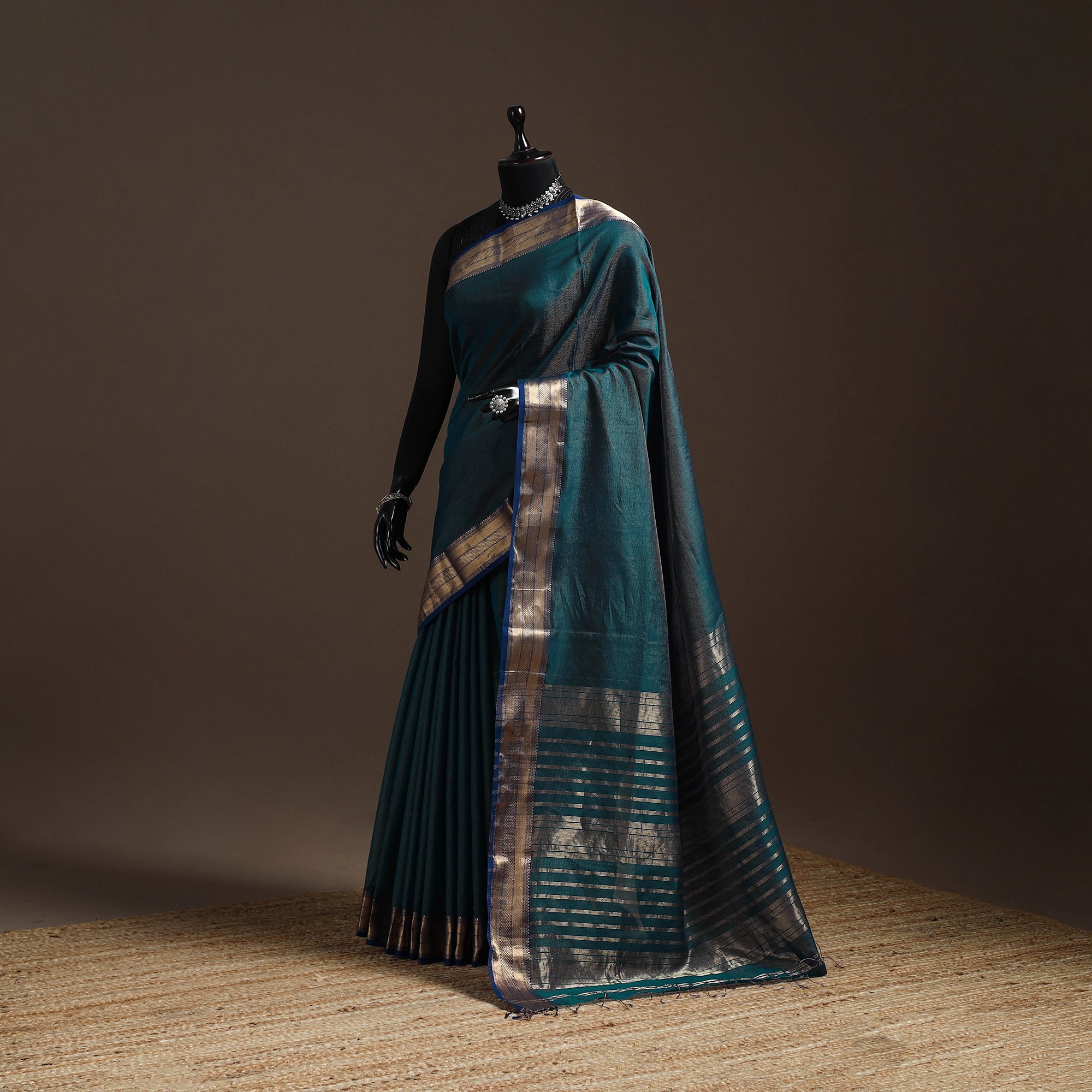 Tissue zari weave maheshwari handloom saree with zari border is woven by artisans in Maheshwar, Madhya Pradesh, using traditional weaving techniques. It uses organza silk 2/130 denial in the warp and mercerised cotton 2/120 in the weft, which gives the saree a comfortable feel and a light sheen. Suitable for both everyday wear and celebrations.