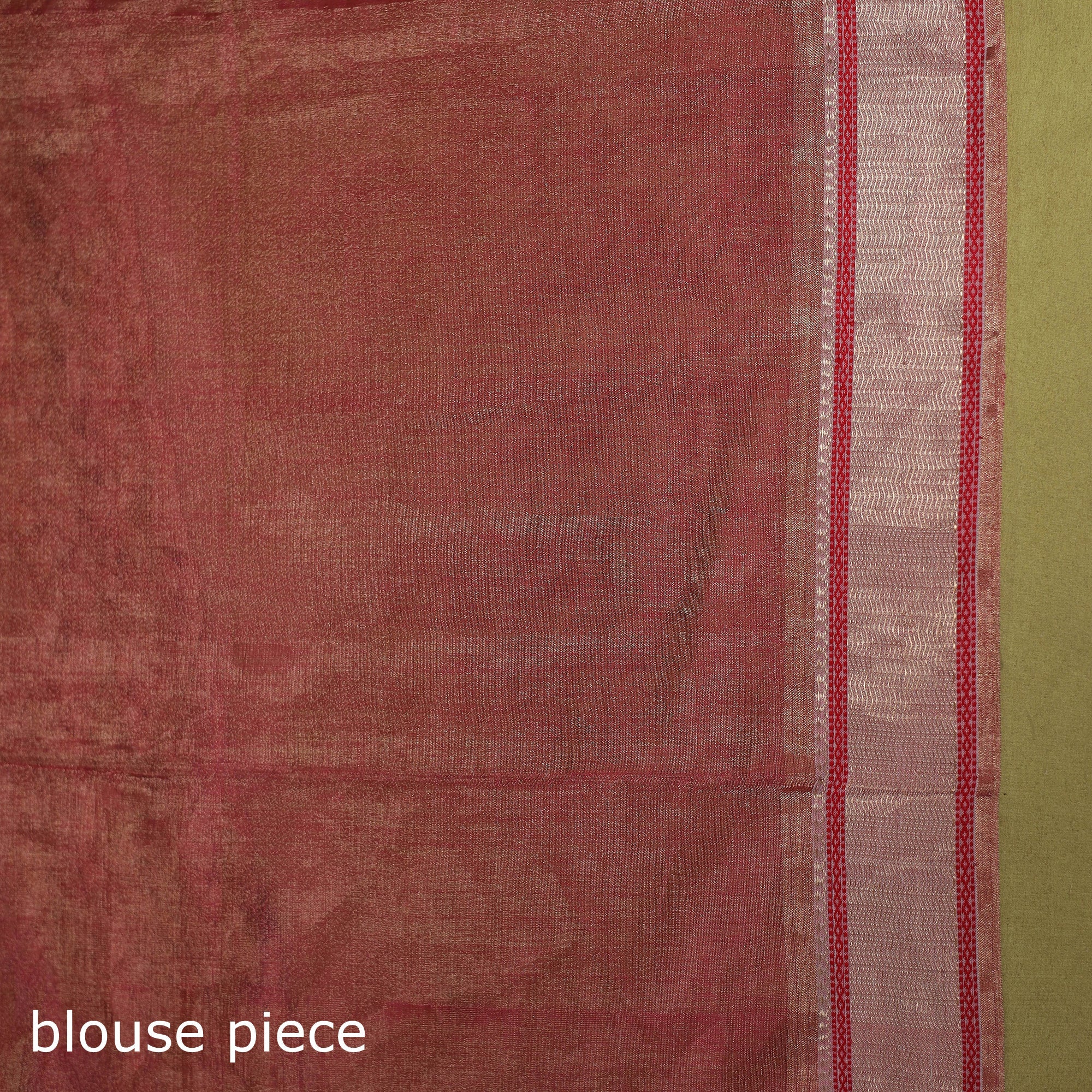 Handloom tissue zari weave silk cotton buti maheshwari saree with zari border is skillfully handwoven in Maheshwar, a heritage town in India, using traditional techniques passed down through generations of skilled artisans. Known for its fine texture and subtle sheen, it beautifully blends silk and cotton for a graceful drape. The rich zari border & buti adds a regal charm, making it ideal for festive occasions and celebrations.