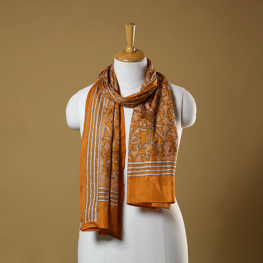Elevate your style with our orange kantha work tussar silk handloom stole from West Bengal. This refined piece showcases contemporary motifs along with detailed embroidery crafted in the traditional kantha technique of the region. Ideal for festive gatherings or cultural occasions, the stole offers a graceful balance of heritage and modern appeal.