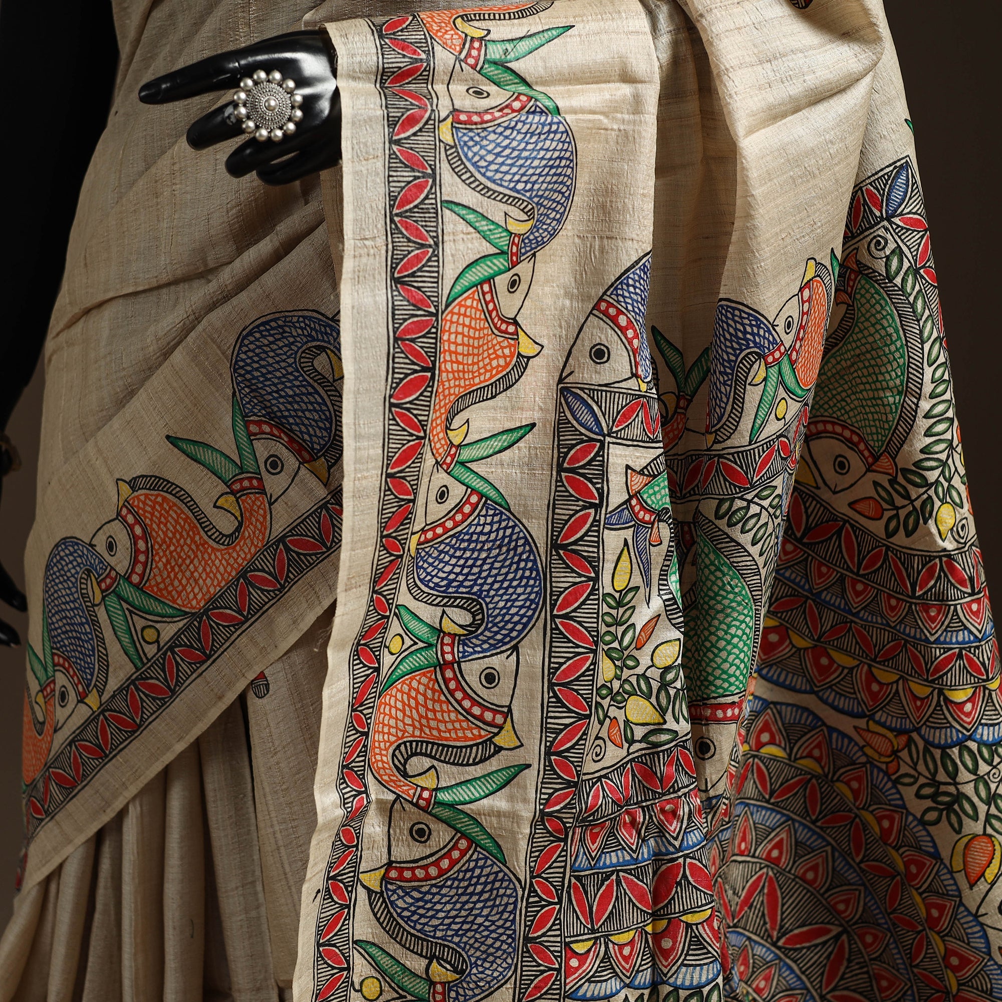 Authentic beige handloom tussar silk cotton hand-painted Madhubani saree by artisan Hira Devi from Bihar. Graceful, Elegant, Durable Saree handpainted with love. Madhubani paintings are famous for motifs and designs based on nature and gods, a widely celebrated art artform worldwide. The tussar silk-cotton blend offers a graceful drape, making it suitable for both festive occasions and everyday wear. A true blend of elegance and culture.