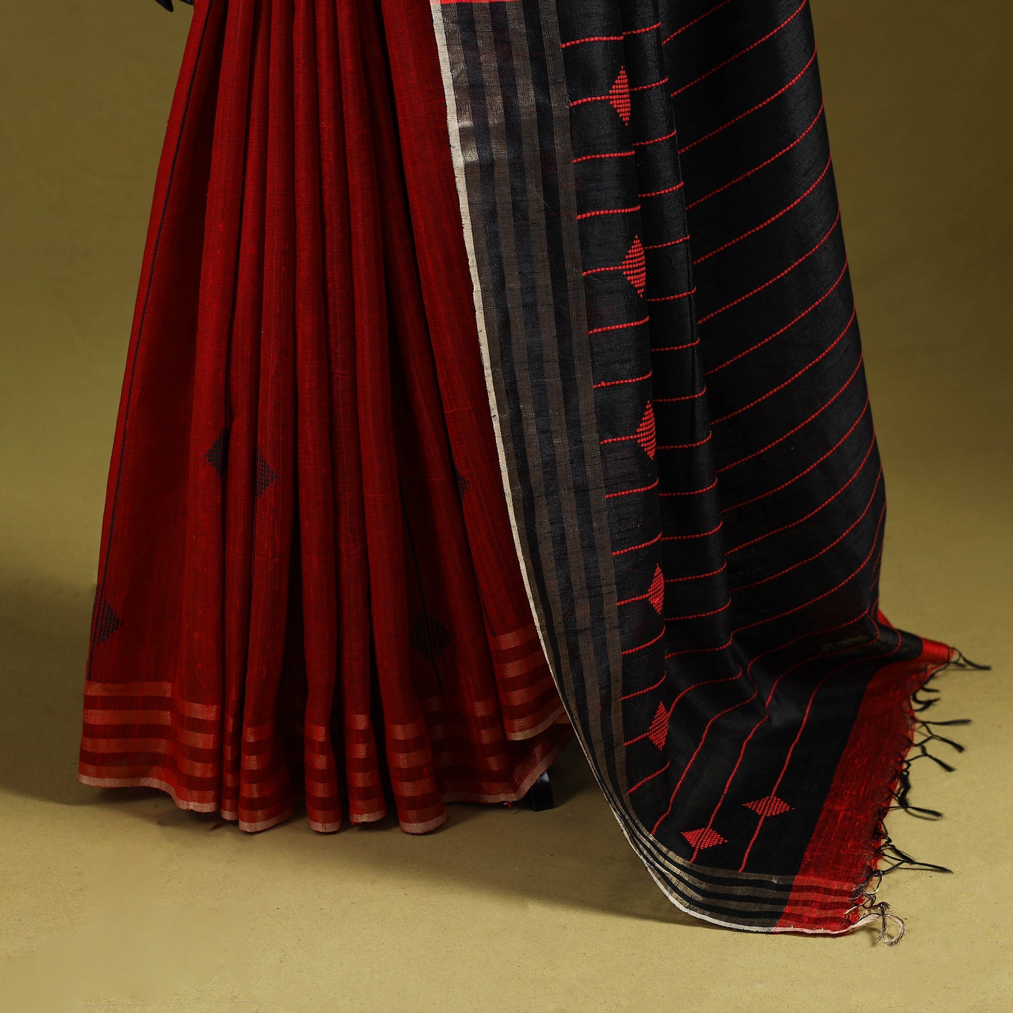 Red pure handloom bhagalpuri saree is made from tussar-dupion silk, sourced from Bhagalpur. Crafted by skilled artisans using age-old weaving methods, it showcases intricate patterns and subtle motifs that capture the essence of bhagalpuri artistry. The zari border lends a refined charm, while the silk’s natural luster and smooth drape make it a pleasure to wear. Perfect for both festive and formal occasions.