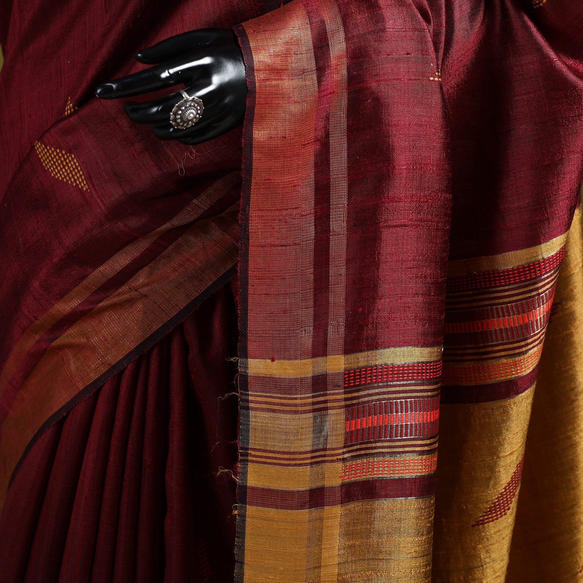 Maroon pure handloom bhagalpuri saree is made from tussar-dupion silk, sourced from Bhagalpur. Crafted by skilled artisans using age-old weaving methods, it showcases intricate patterns and subtle motifs that capture the essence of bhagalpuri artistry. The zari border lends a refined charm, while the silk’s natural luster and smooth drape make it a pleasure to wear. Perfect for both festive and formal occasions.