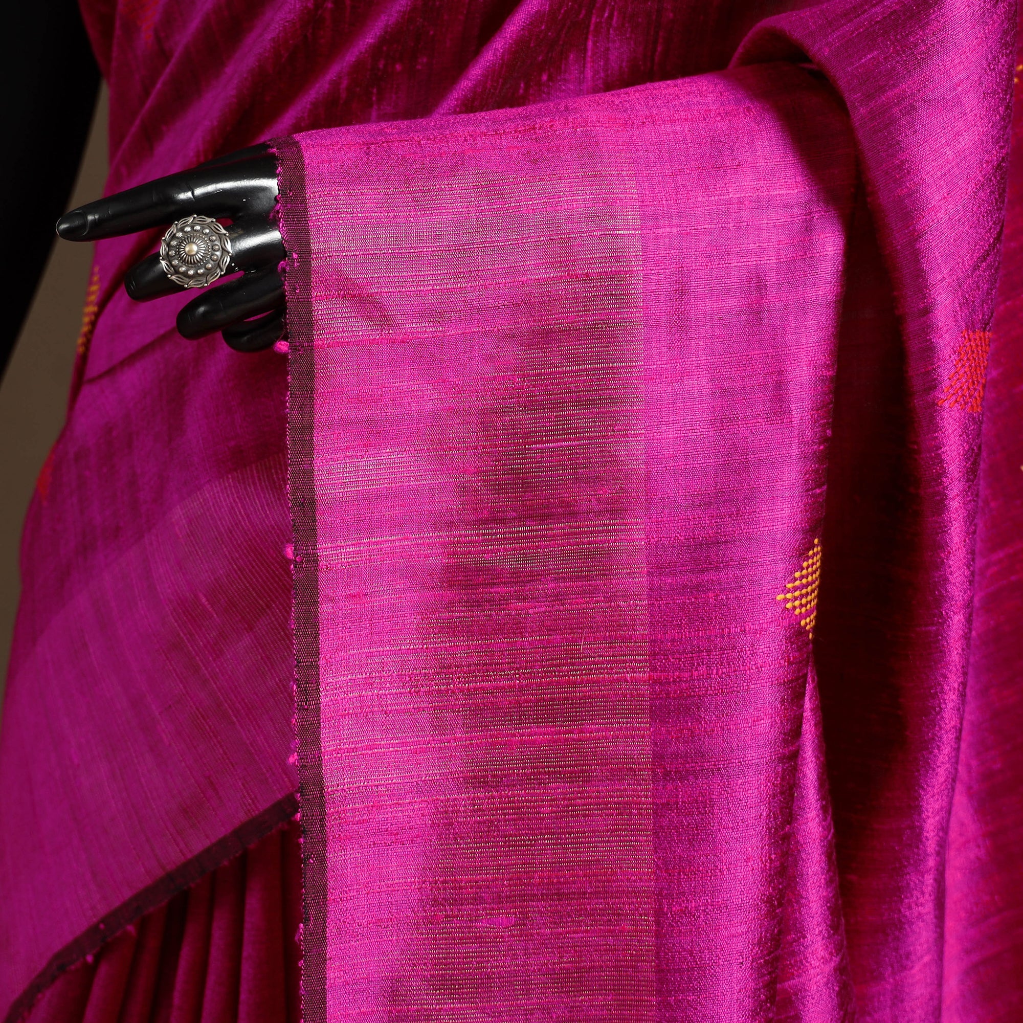This beautiful pink bhagalpuri saree is made from tussar-dupion silk, sourced from Bhagalpur. Crafted by skilled artisans using age-old weaving methods, it showcases intricate patterns and subtle motifs that capture the essence of bhagalpuri artistry. The zari border lends a refined charm, while the silk’s natural luster and smooth drape make it a pleasure to wear. Perfect for both festive and formal occasions.