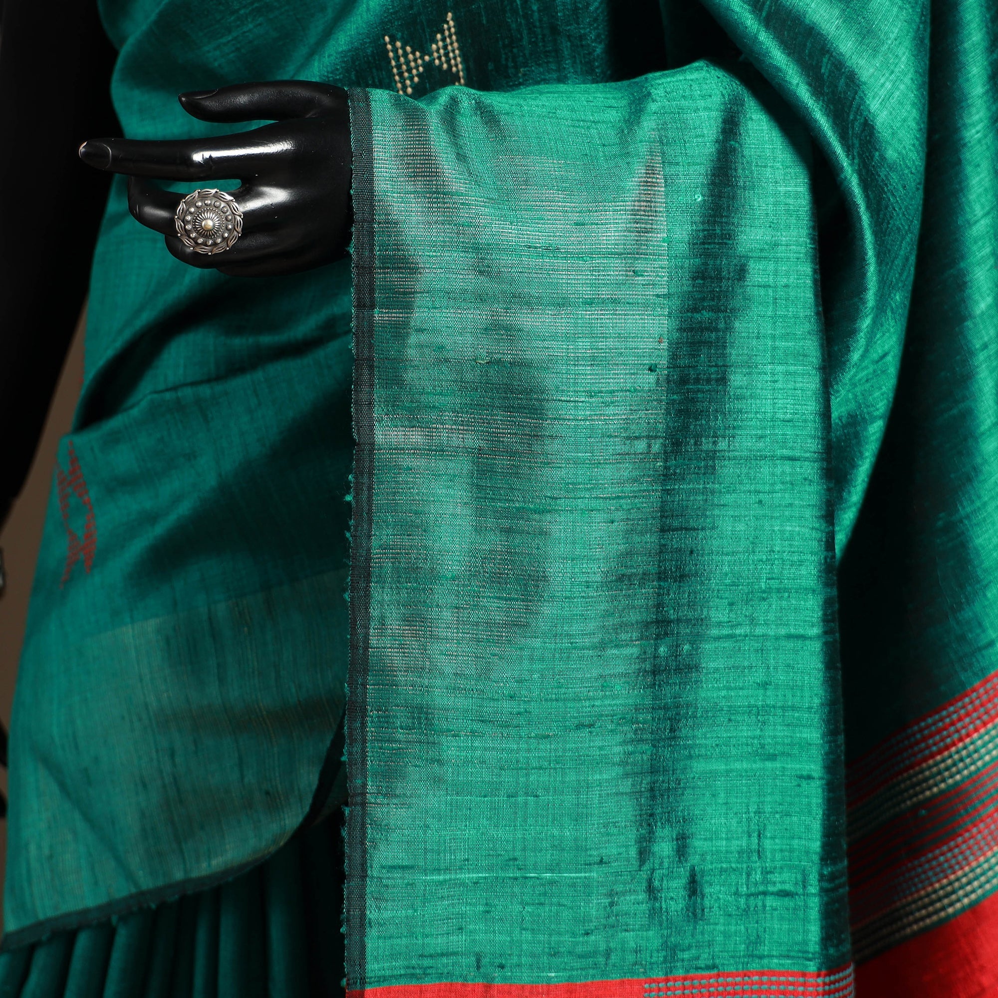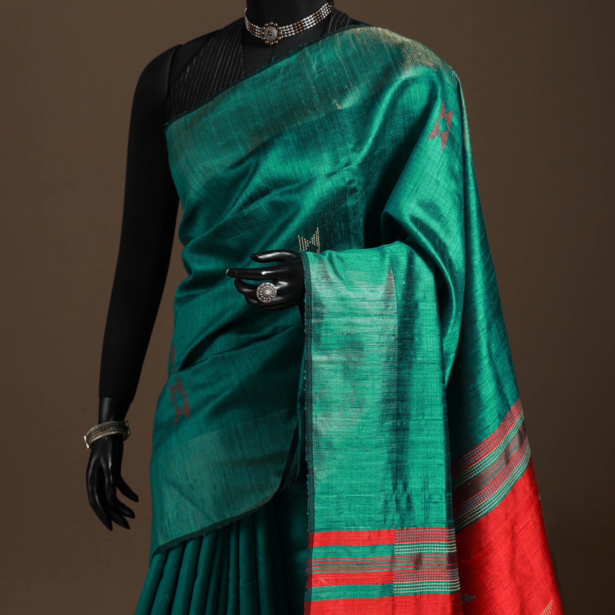 This beautiful green bhagalpuri saree is made from tussar-dupion silk, sourced from Bhagalpur. Crafted by skilled artisans using age-old weaving methods, it showcases intricate patterns and subtle motifs that capture the essence of bhagalpuri artistry. The zari border lends a refined charm, while the silk’s natural luster and smooth drape make it a pleasure to wear. Perfect for both festive and formal occasions.