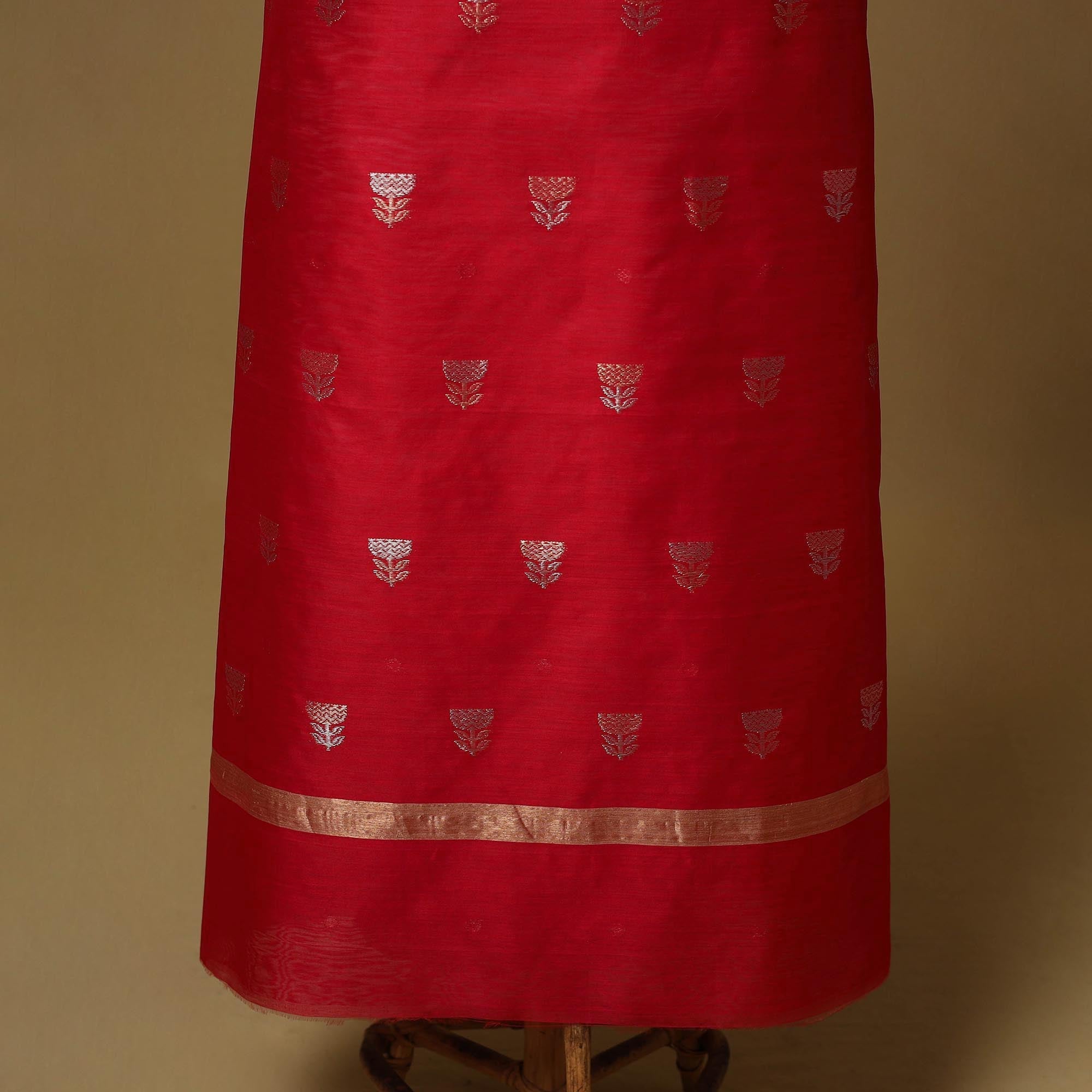 | Material | Red handloom chanderi 2pc unstitched dress material is crafted by master artisan Rauf Khan in Chanderi, Madhya Pradesh. Made from a chanderi silk and mercerised cotton blend, it features zari buti motifs and a woven border. Lightweight with a sheer drape, the set includes fabric for a kurta and dupatta, making it ideal for festive occasions, family gatherings and cultural events. |
