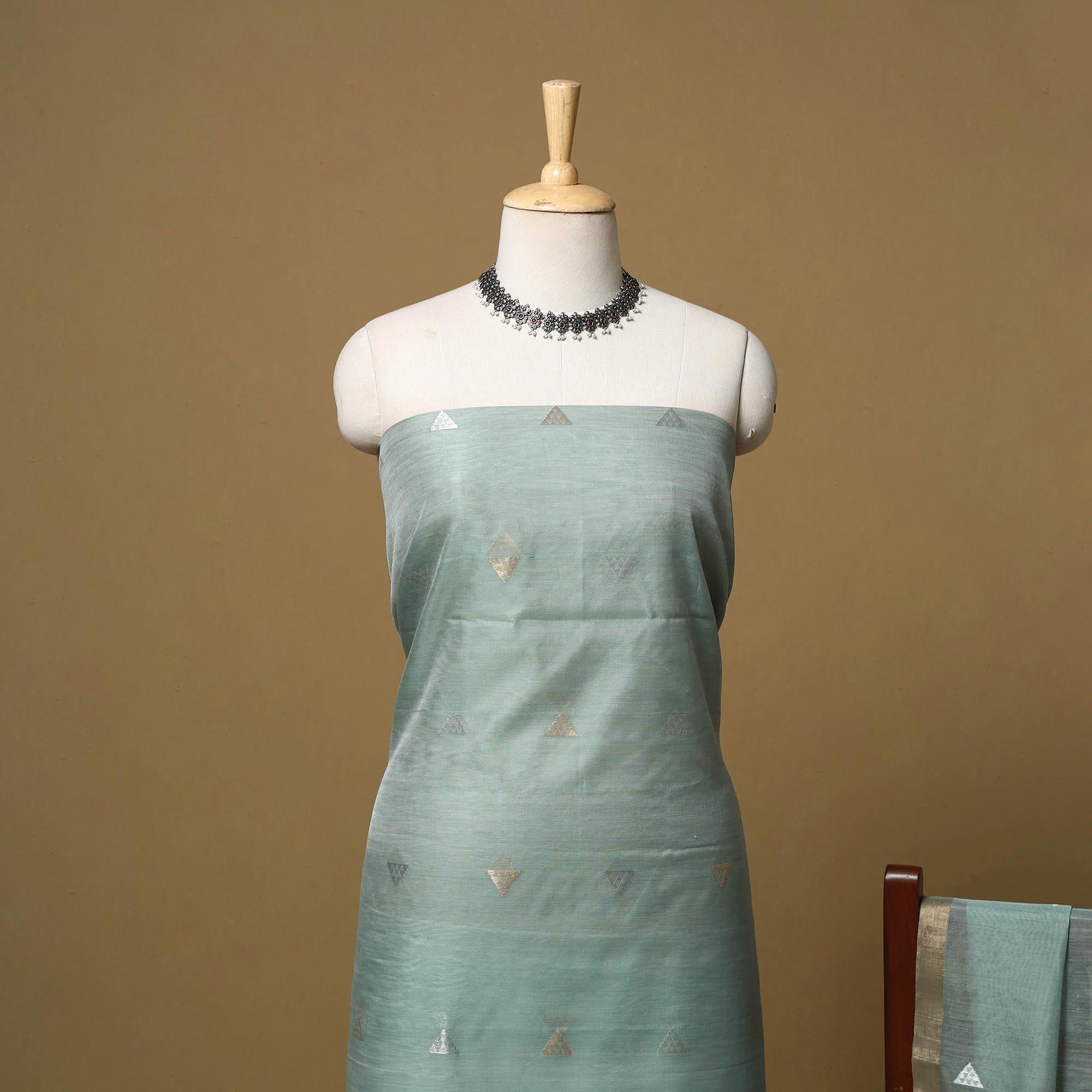 Green handloom chanderi 2pc unstitched dress material is crafted by master artisan Rauf Khan in Chanderi, Madhya Pradesh. Made from a chanderi silk and mercerised cotton blend, it features zari buti motifs and a woven border. Lightweight with a sheer drape, the set includes fabric for a kurta and dupatta, making it ideal for festive occasions, family gatherings and cultural events.
