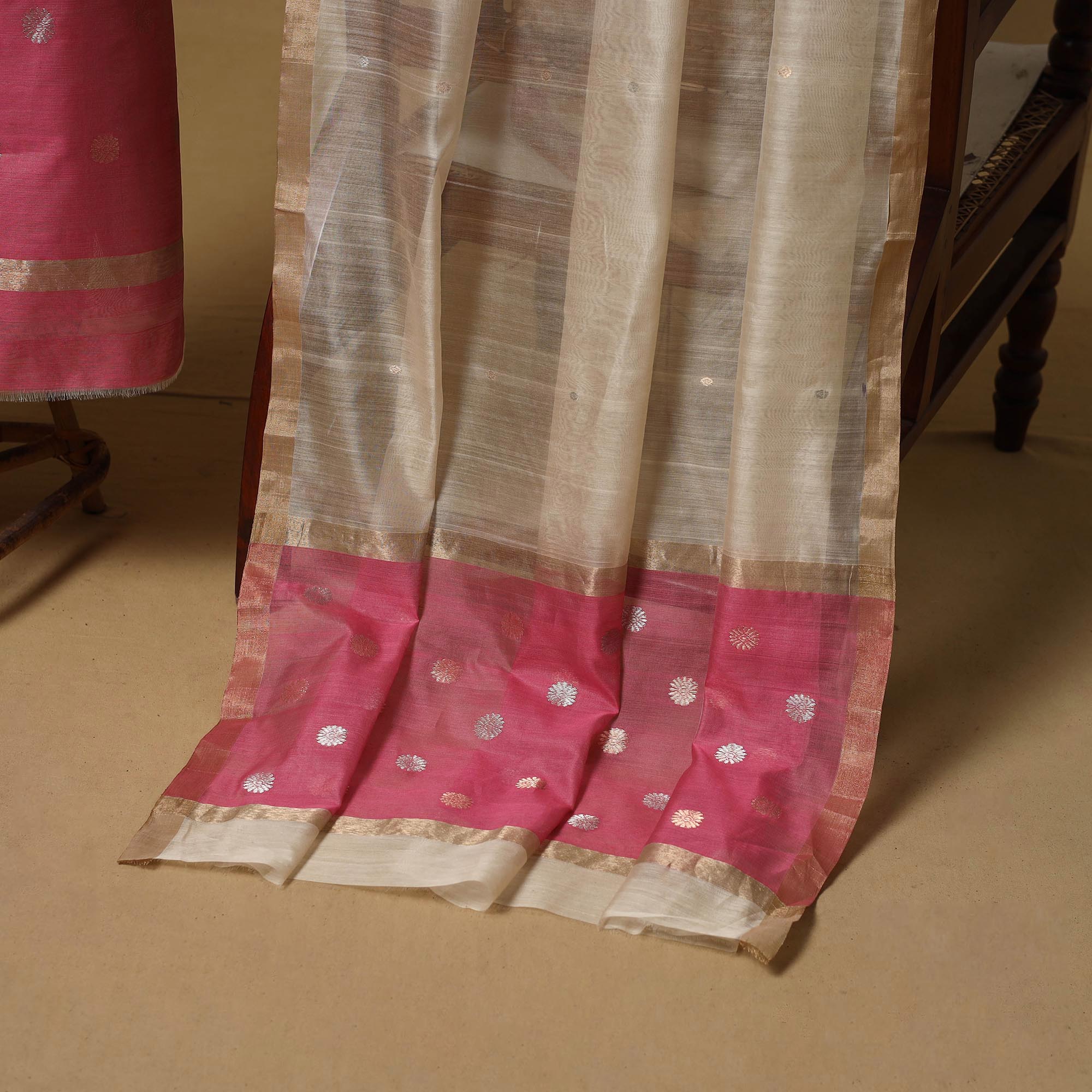 Pink handloom chanderi 2pc unstitched dress material is crafted by master artisan Rauf Khan in Chanderi, Madhya Pradesh. Made from a chanderi silk and mercerised cotton blend, it features zari buti motifs and a woven border. Lightweight with a sheer drape, the set includes fabric for a kurta and dupatta, making it ideal for festive occasions, family gatherings and cultural events.
