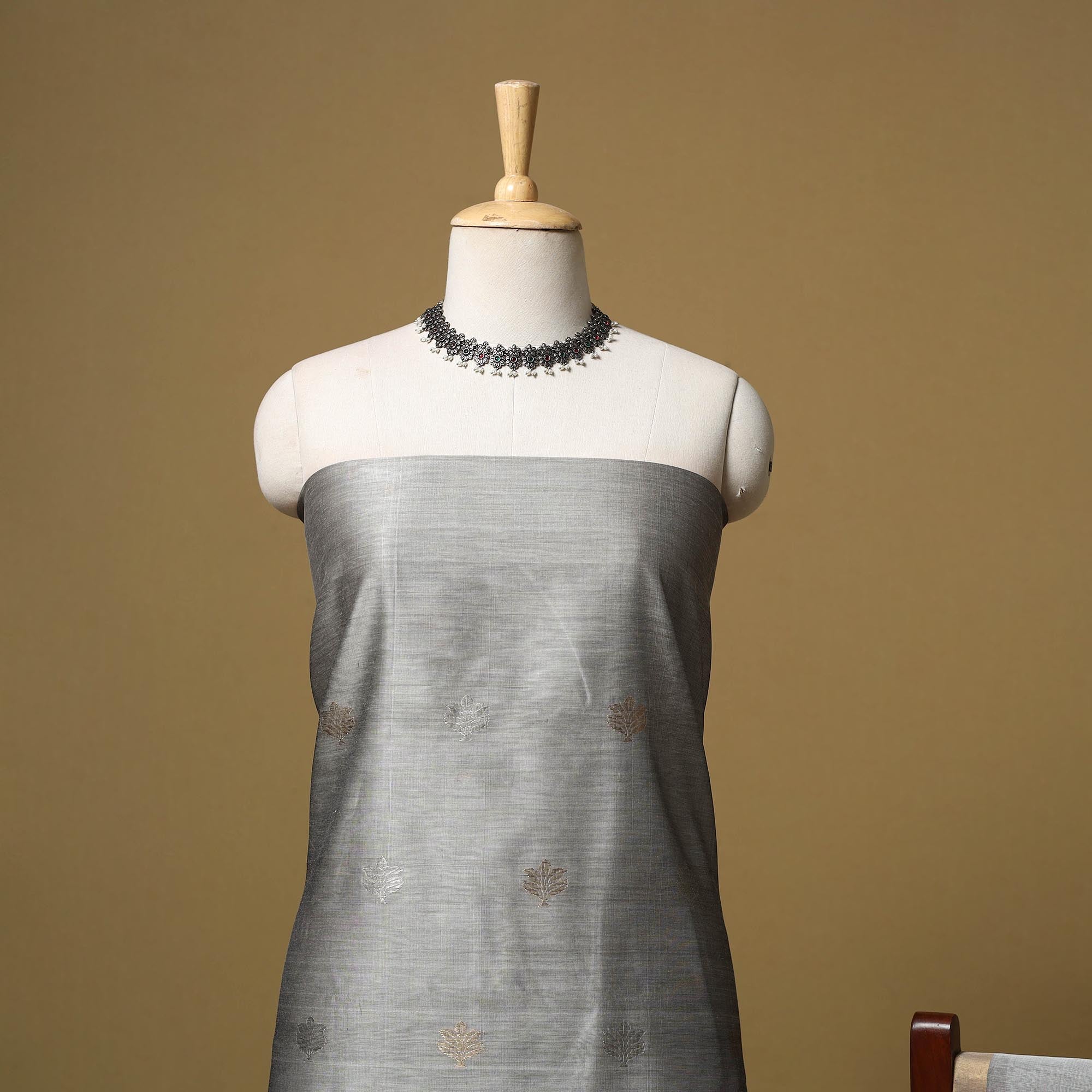 Grey handloom chanderi 2pc unstitched dress material is crafted by master artisan Rauf Khan in Chanderi, Madhya Pradesh. Made from a chanderi silk and mercerised cotton blend, it features zari buti motifs and a woven border. Lightweight with a sheer drape, the set includes fabric for a kurta and dupatta, making it ideal for festive occasions, family gatherings and cultural events.