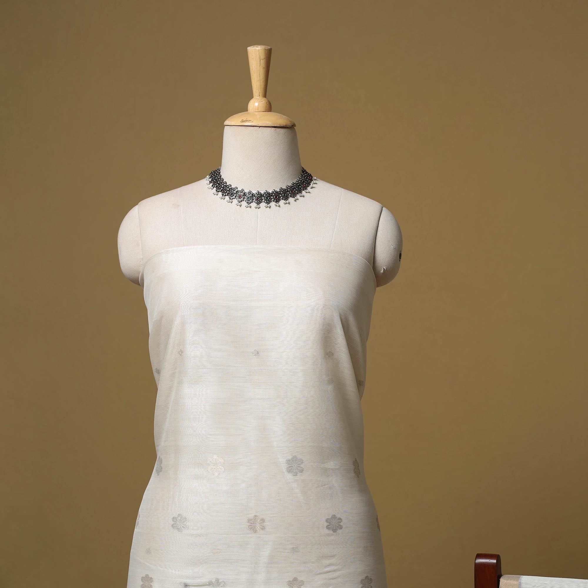 White - Handloom Zari Buti Pure Chanderi Silk Fabric 14