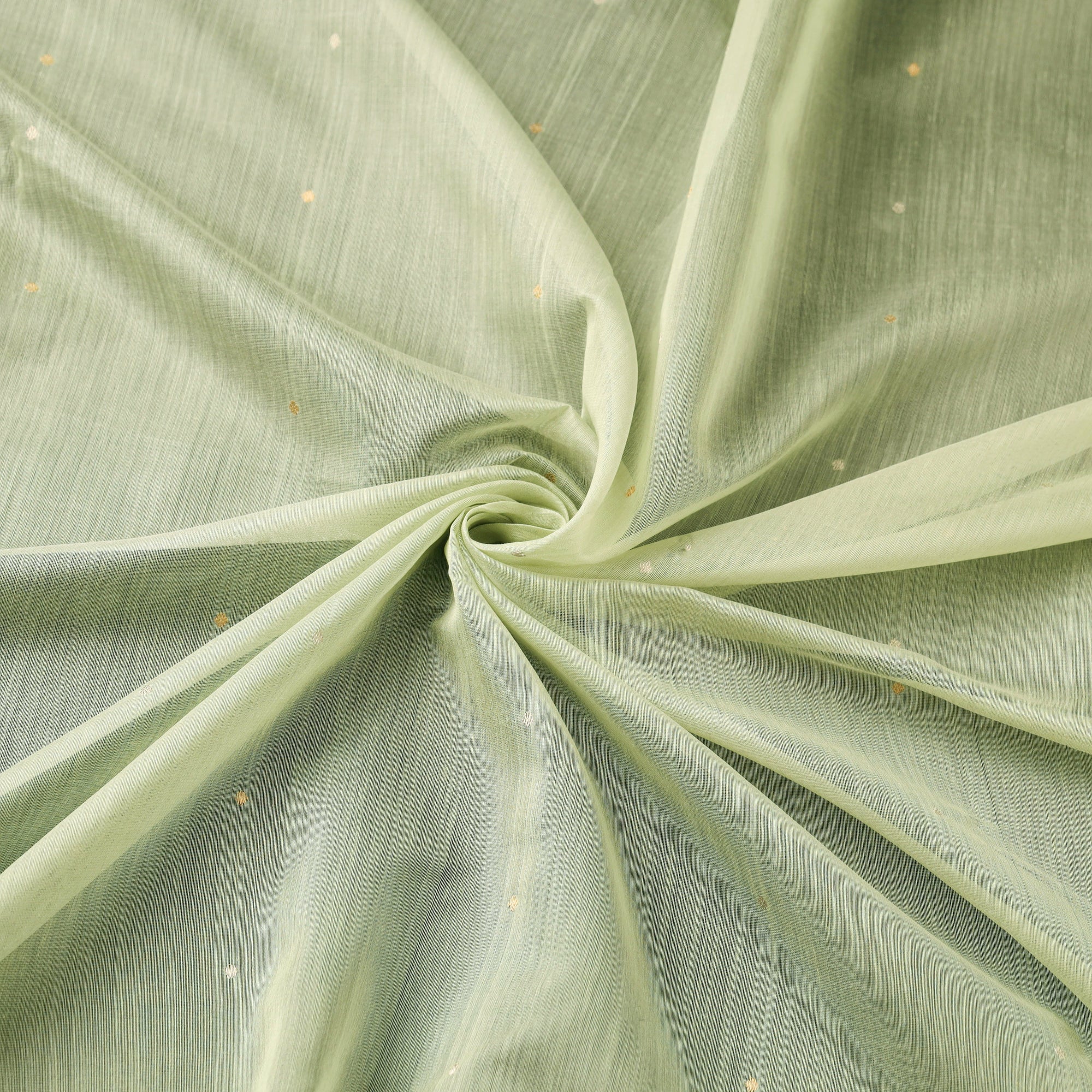 Green pure handloom zari buti chanderi fabric is woven by master artisan Rauph Khan from Madhya Pradesh. Originating from the historic town of Chanderi, this weave is known for its lightweight texture and sheer elegance. Handloom weaving in chanderi combines silk and mercerised cotton threads to create a fabric that feels airy yet refined. Perfect for crafting kurtas, dresses, blouses, skirts, dupattas, curtains, cushion covers and more.