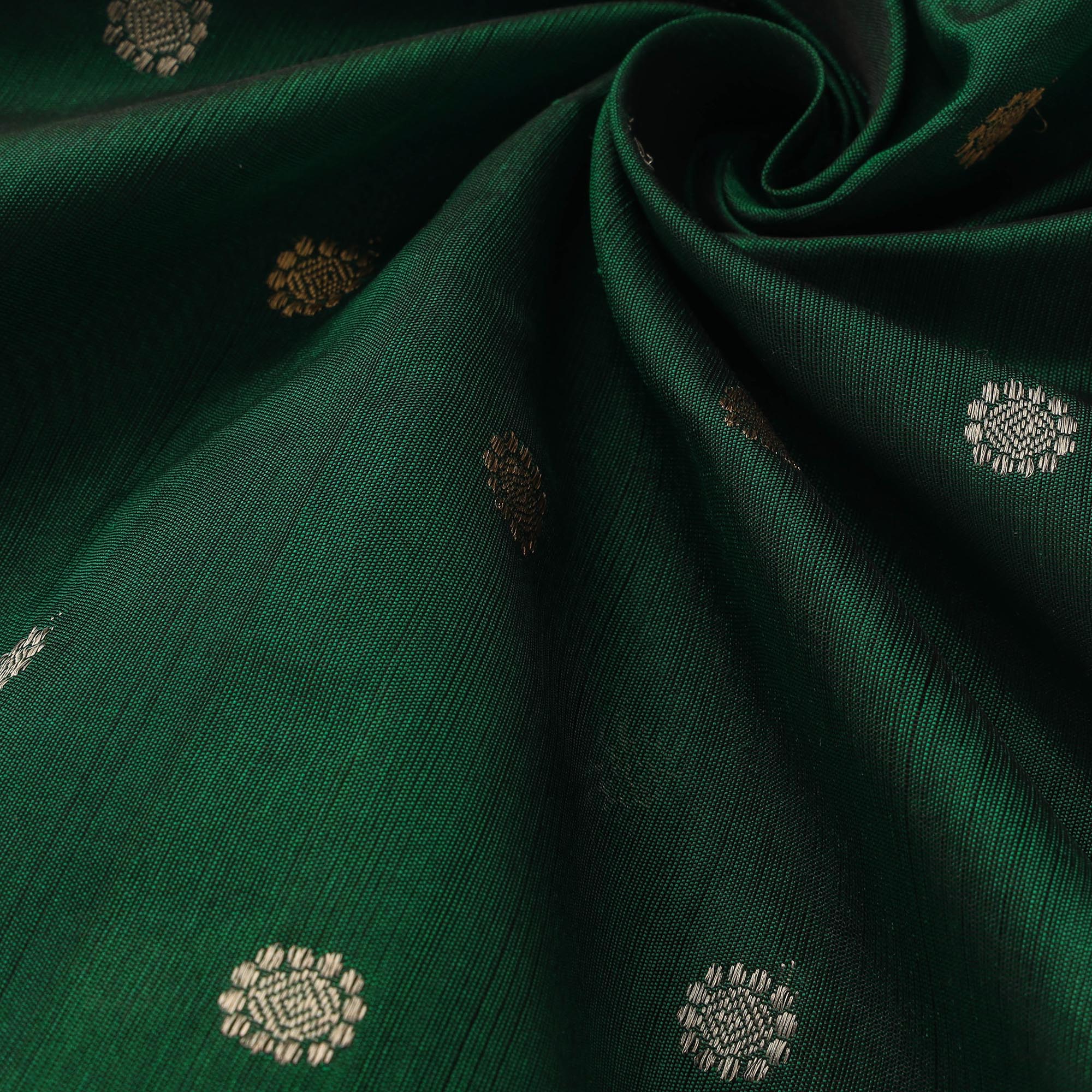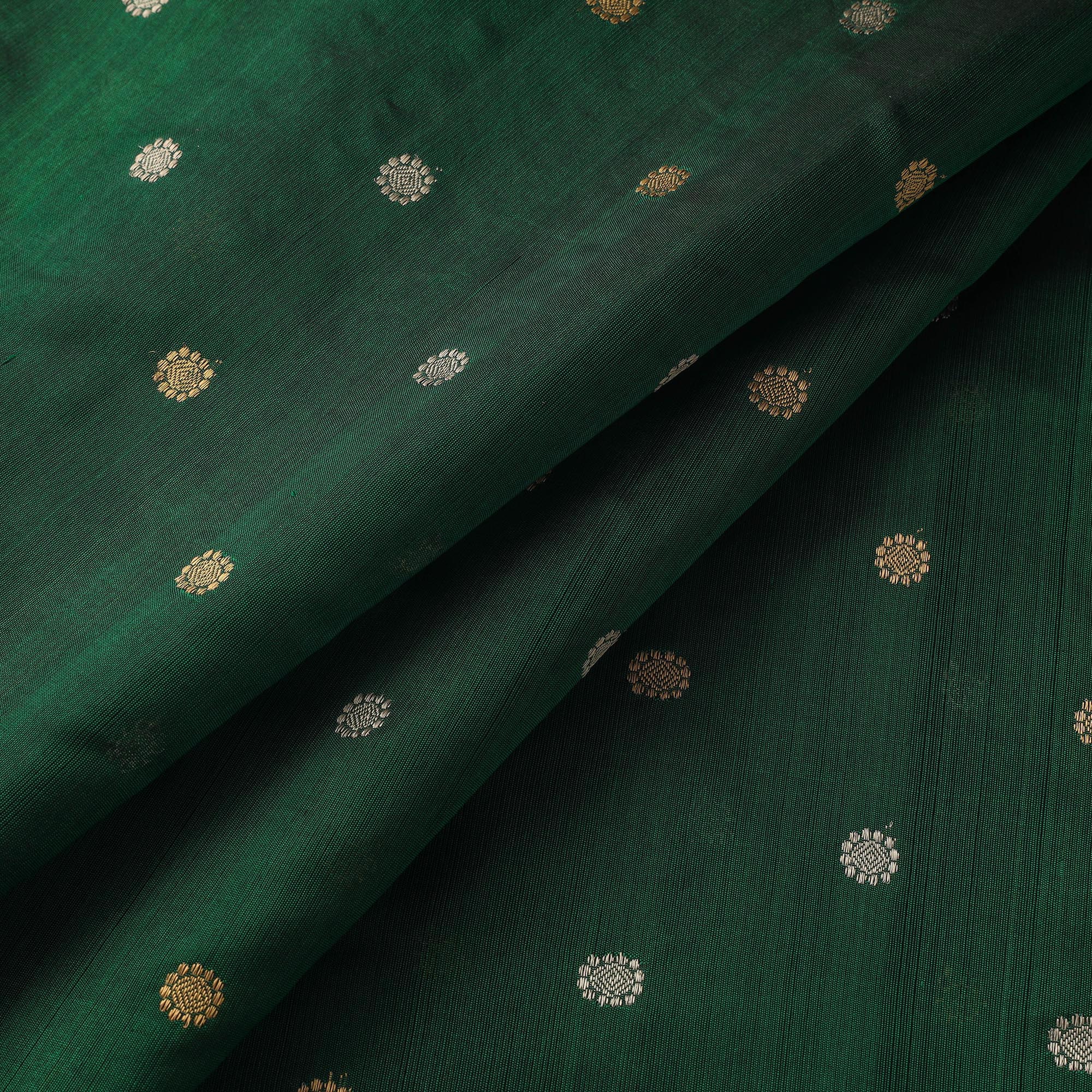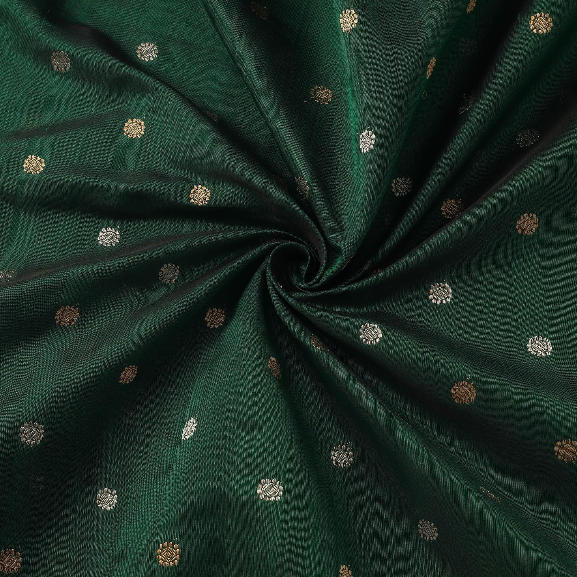 Green handloom zari buti pure chanderi silk fabric woven by master artisan Sagir Ahmed from Madhya Pradesh. Originating from the historic town of chanderi this weave is known for lightweight texture and sheer elegance.