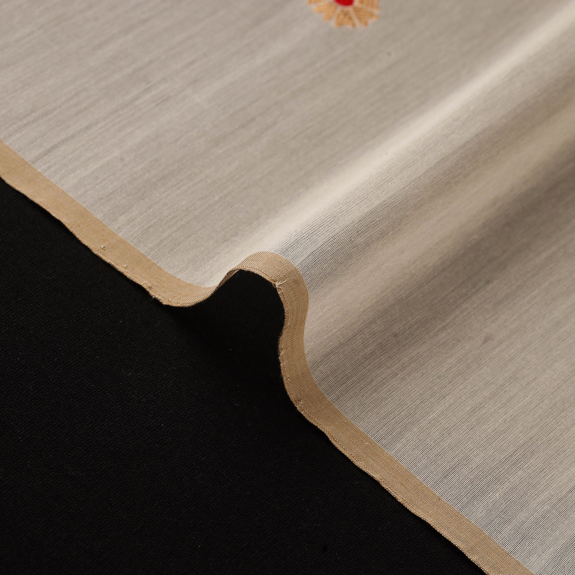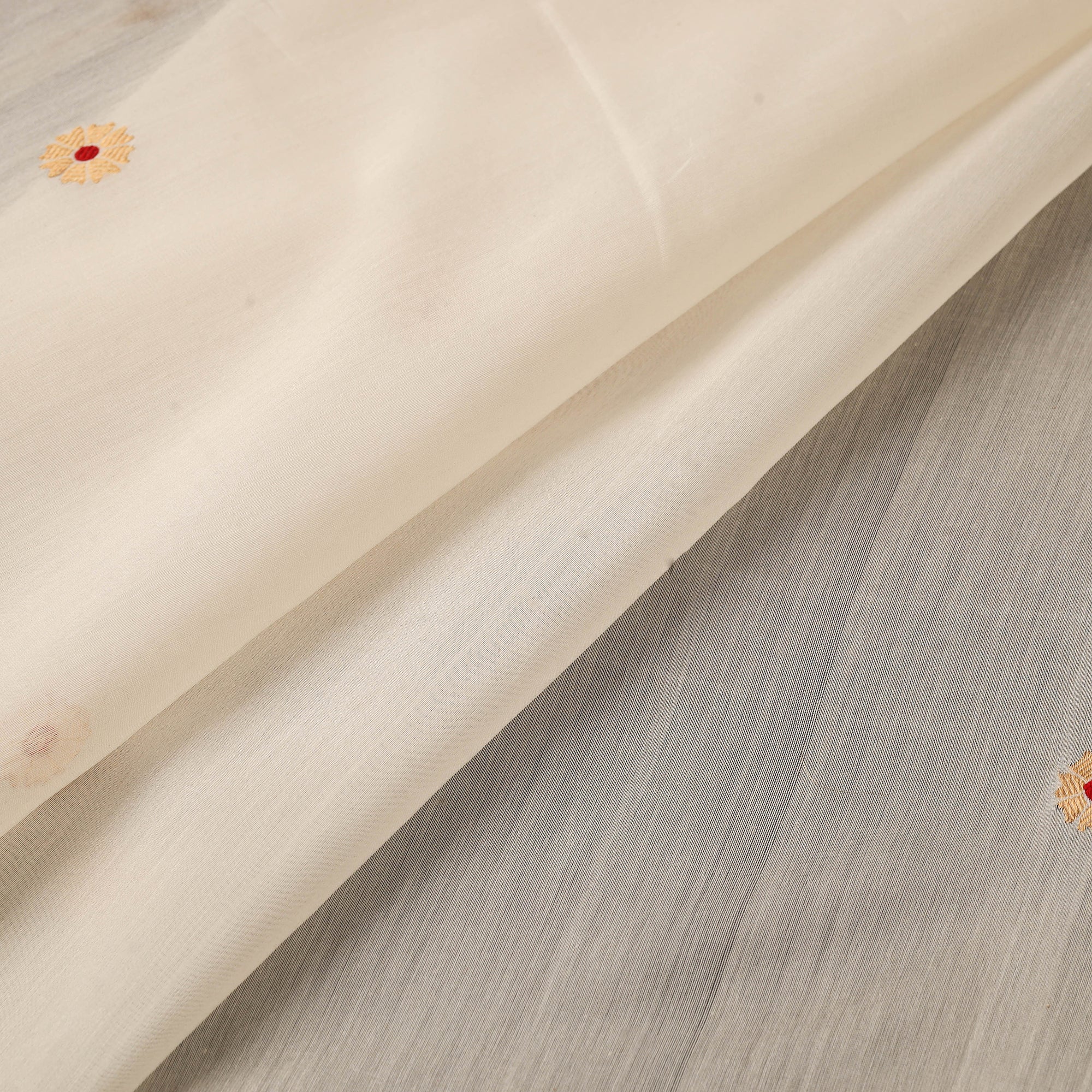 White pure handloom zari meena buti chanderi fabric is woven by master artisan Rauph Khan from Madhya Pradesh. Originating from the historic town of Chanderi this weave is known for its lightweight texture and sheer elegance. Handloom weaving in chanderi combines silk and mercerised cotton threads to create a fabric that feels airy yet refined. Perfect for crafting kurtas, dresses, blouses, skirts, dupattas, curtains, cushion covers and more.