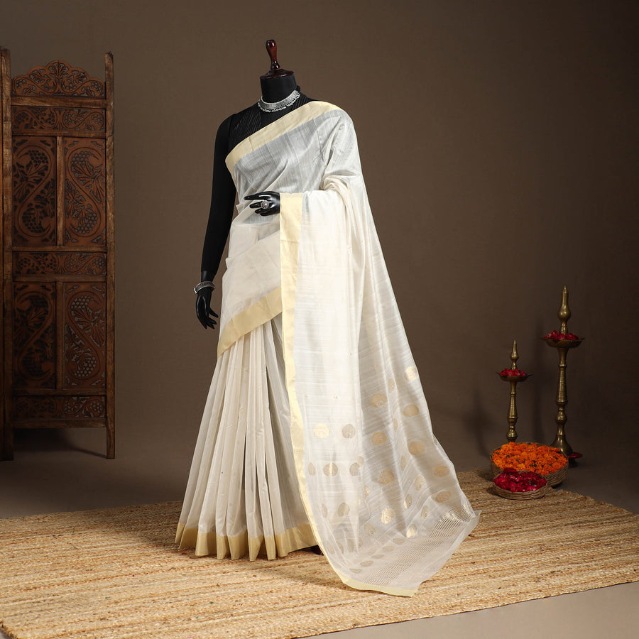 This elegant white chanderi silk saree is handwoven by skilled artisans from Chanderi, Madhya Pradesh. Crafted from a fine blend of silk and cotton, it showcases delicate buttis created with separate needles, reflecting both precision and tradition. The shimmering zari border lends a regal touch, making it an ideal choice for festive occasions, weddings, or graceful gatherings.